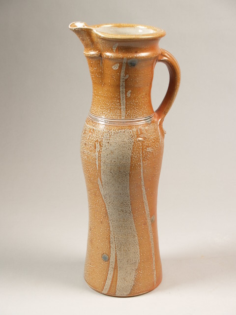 Hoge kan met gestileerd oor en tuit overdekt met bruin zoutglazuur waarin blauwe stippen