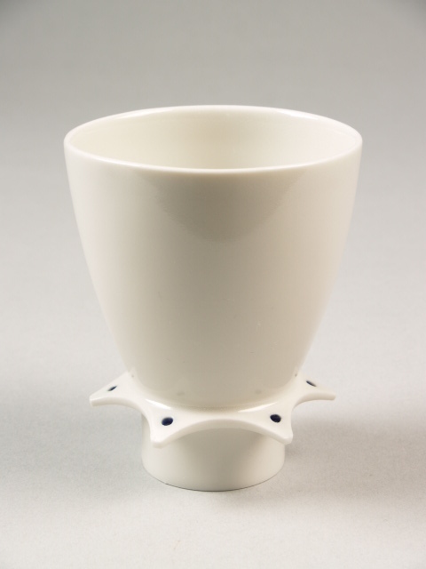 Twee sets van 2 bekers waarbij de voetring is voorzien van een gelobde kraag. In een mannelijke (Prins) en een vrouwelijke (Prinses) variant. Kragen zijn voorzien van een zestal gaatjes die van binnen blauw zijn geglazuurd