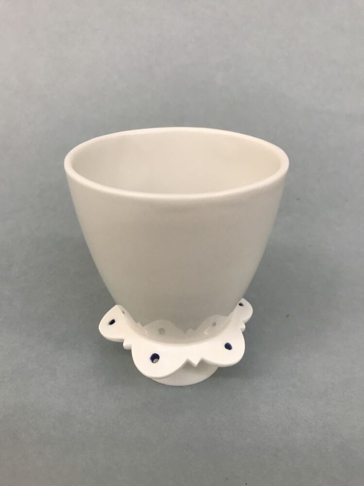 Twee sets van 2 bekers waarbij de voetring is voorzien van een gelobde kraag. In een mannelijke (Prins) en een vrouwelijke (Prinses) variant. Kragen zijn voorzien van een zestal gaatjes die van binnen blauw zijn geglazuurd