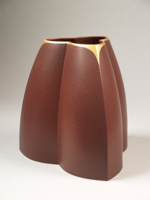 Klavervormige vaas met ox-blood glazuur en goudluster aan de bovenrand