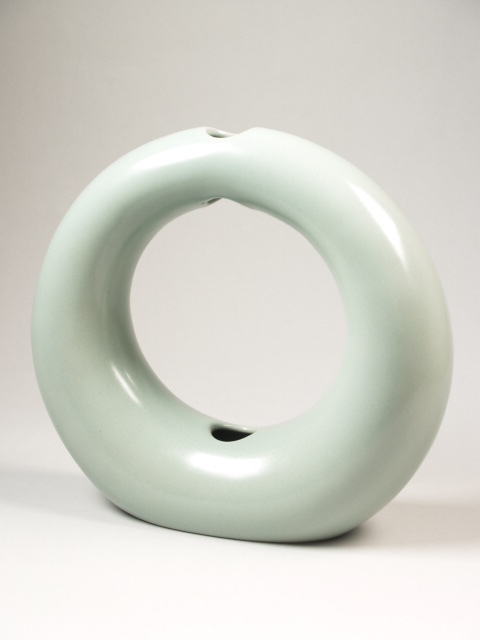 Vaas in cirkelvorm met drie kleine openingen, overdekt met celadonkleurig glazuur