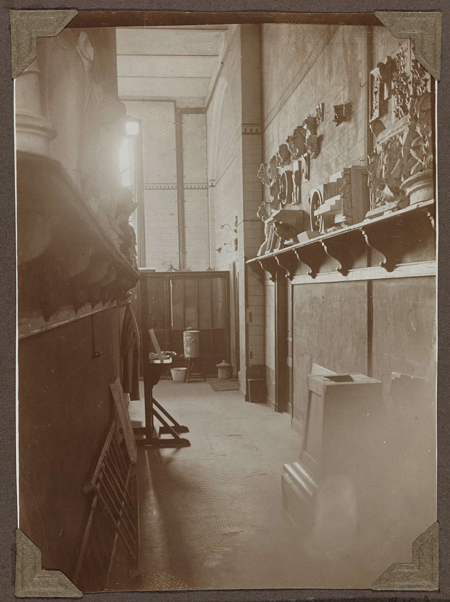 Gang (Rijksnormaalschool?), met rechts een plank waarop gipsmodellen te zien zijn. Troggewelf. Wand naast venster met tegelbeschildering, in het midden sierlijst, om de hoek doorlopend over blind venster (doorgang) en wand. Lambrizering aan vensterzijde.