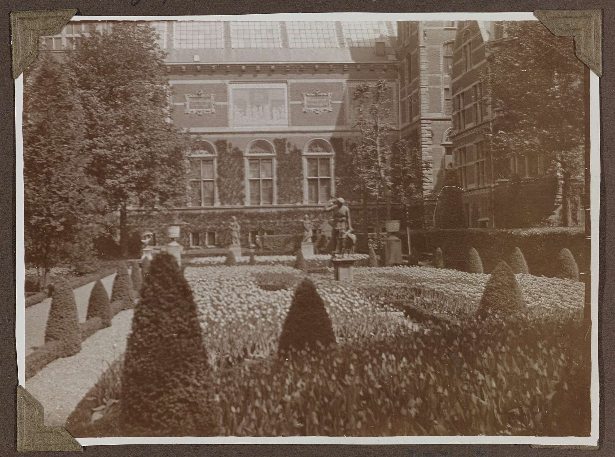 De zuidelijke tuin tijdens de Olympische Spelen in 1928. Ter gelegenheid van de Spelen werden 30.000 tulpenbollen geplant in de tuin van het Rijksmuseum. Tevens zicht op de gevels VII-VIII en rechts de westgevel van de directeurswoning. In de tuin staan verschillende beelden opgesteld, waaronder het tuinbeeld Diana op jacht.