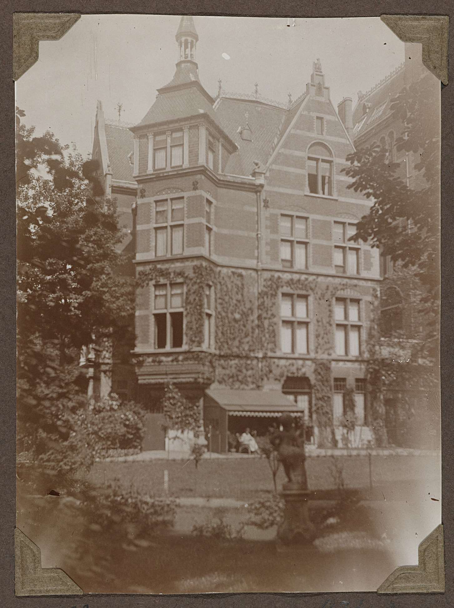 Vanuit de oostelijke tuin zicht op de villa. Onder een zonnescherm zit de familie in de tuin. Oostgevel van de directeurswoning. De voet van het gebouw, de deur- en vensterdorpels zijn van Belgisch graniet. De muren zijn in rode baksteen opgetrokken met banden en hoekstenen in witte bergsteen. De nok van het dak is voorzien ...
