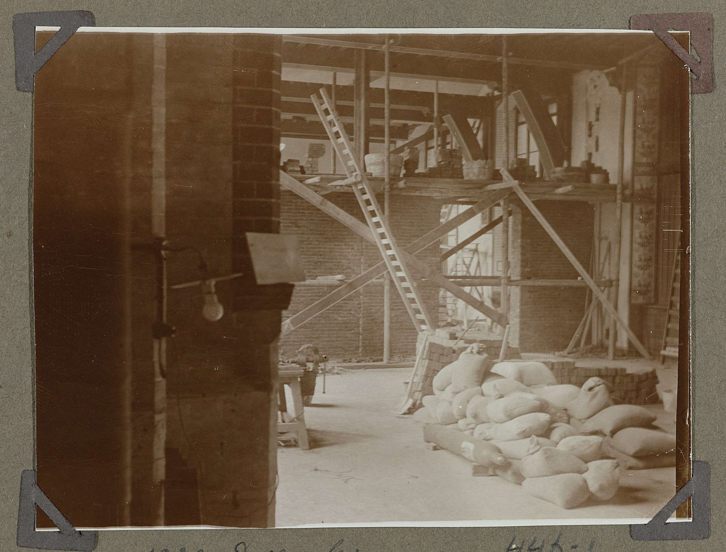 Zicht op zaal 163/164 ? met rechts op de foto een opeenstapeling van zakken en in het midden een ladder en steigers. Zaal M 109 of M110 gezien naar het zuidwesten. De zaal wordt verbouwd. Boven een deel een kopie van de zoldering van het stadhuis van Sluis, die in het jaar waarin deze foto ...