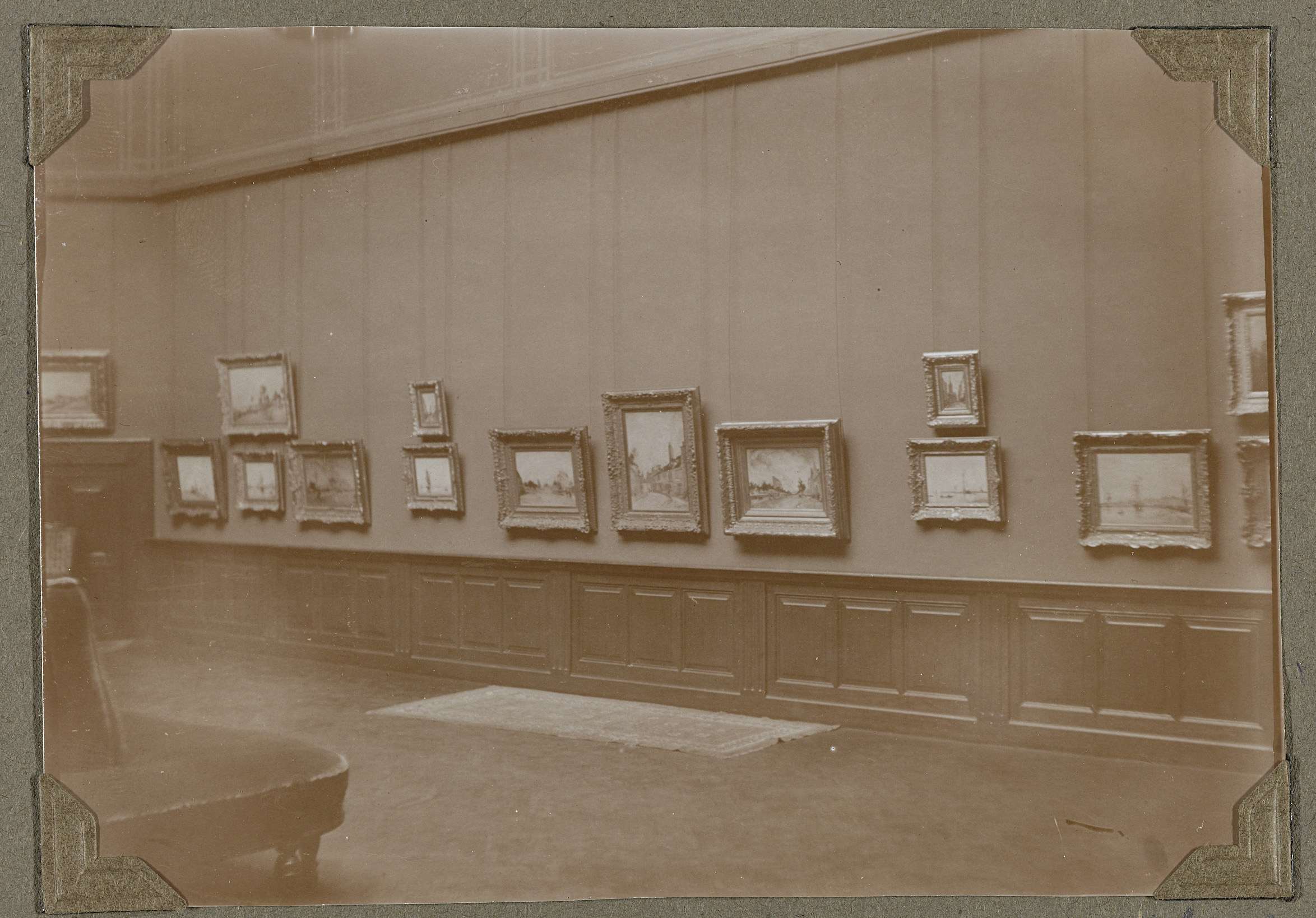 Zicht op muur met verschillende werken van Jongkind. Voor de tentoonstelling van werken van Jonkind, gehouden onder leiding van het genootschap Nederland-Frankrijk, werden drie zalen in de Druckeruitbouw ter beschikking gesteld. De schilderijen en aquarellen werden chronologisch geplaatst door F. Schmidt-Degener en D.C. Röell. Zaal 358 (M18) in de Druckeruitbouw, gezien naar het noordwesten. Parket ...