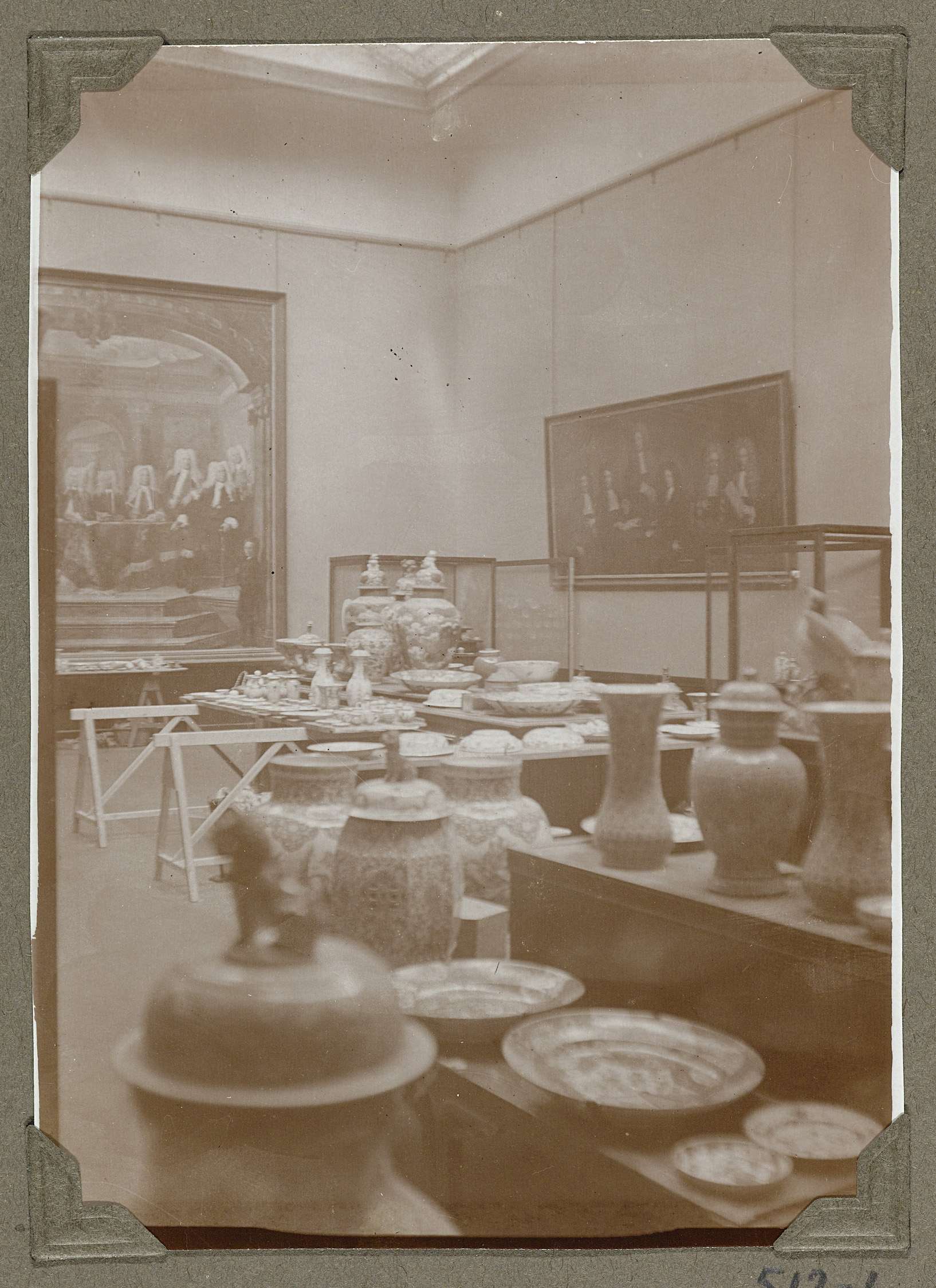 Op de voorgrond staan verschillende chineze vazen. Op de achtergrond zicht op grote 18e eeuwse regentstukken van Troost