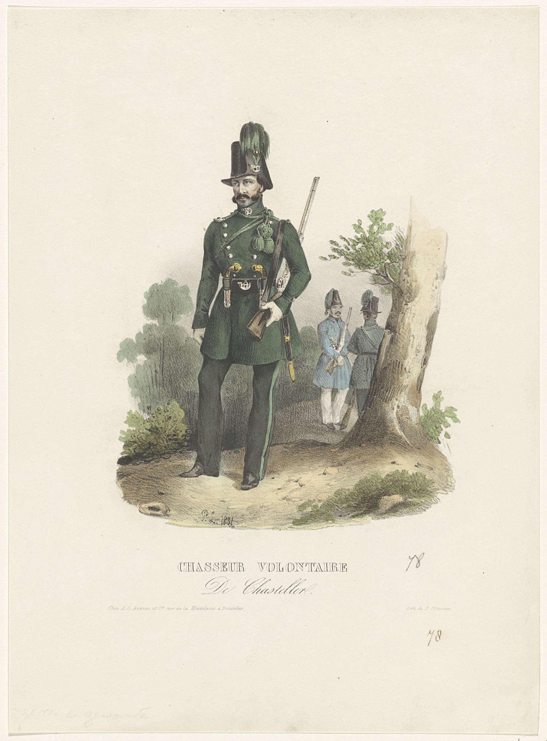 Een Belgische jager, een Chasseur du Marquis de Chasteler, een bataljon vrijwilligers opgericht in 1830. Onderdeel van een groep voorstellingen van Belgische uniformen.