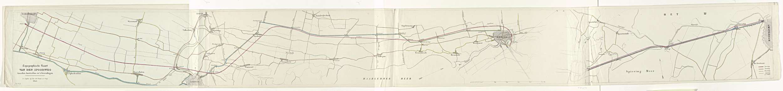 Kaart van de spoorlijn van de Hollandsche IJzeren Spoorweg-Maatschappij tussen Amsterdam en Den Haag, 1842. Kaart bestaande uit vier aan elkaar geplakte bladen, lopend van Den Haag (links), via Leiden, Hillegom en Haarlem naar Amsterdam (rechts).