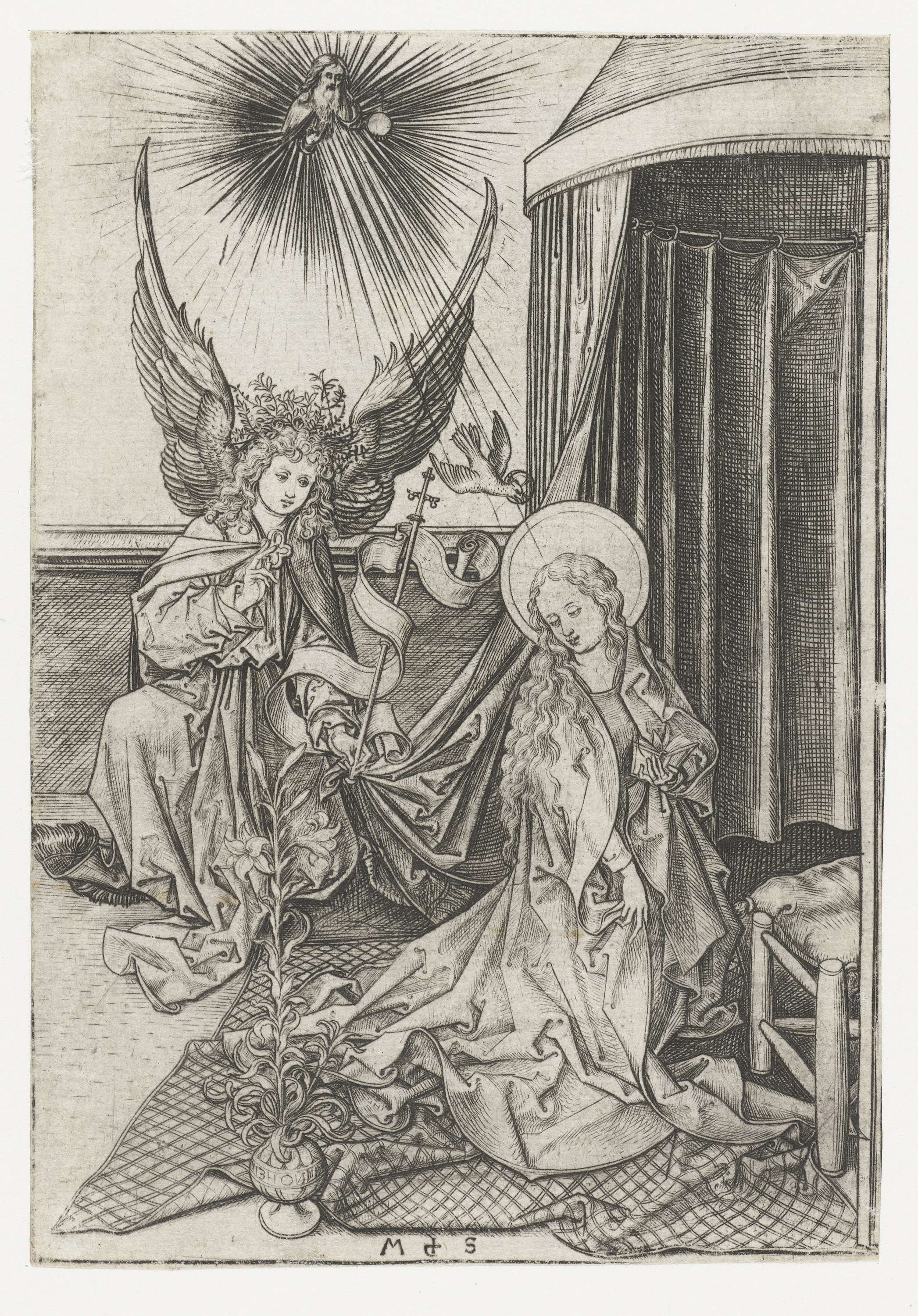 De aankondiging van de geboorte van Christus aan Maria: de engel Gabriël verschijnt aan Maria, die bij een tent geknield zit te lezen, naast een vaas met een lelie. Vanuit de hemel kijkt God toe; de Heilige Geest in de gedaante van een duif vliegt op Maria af.
