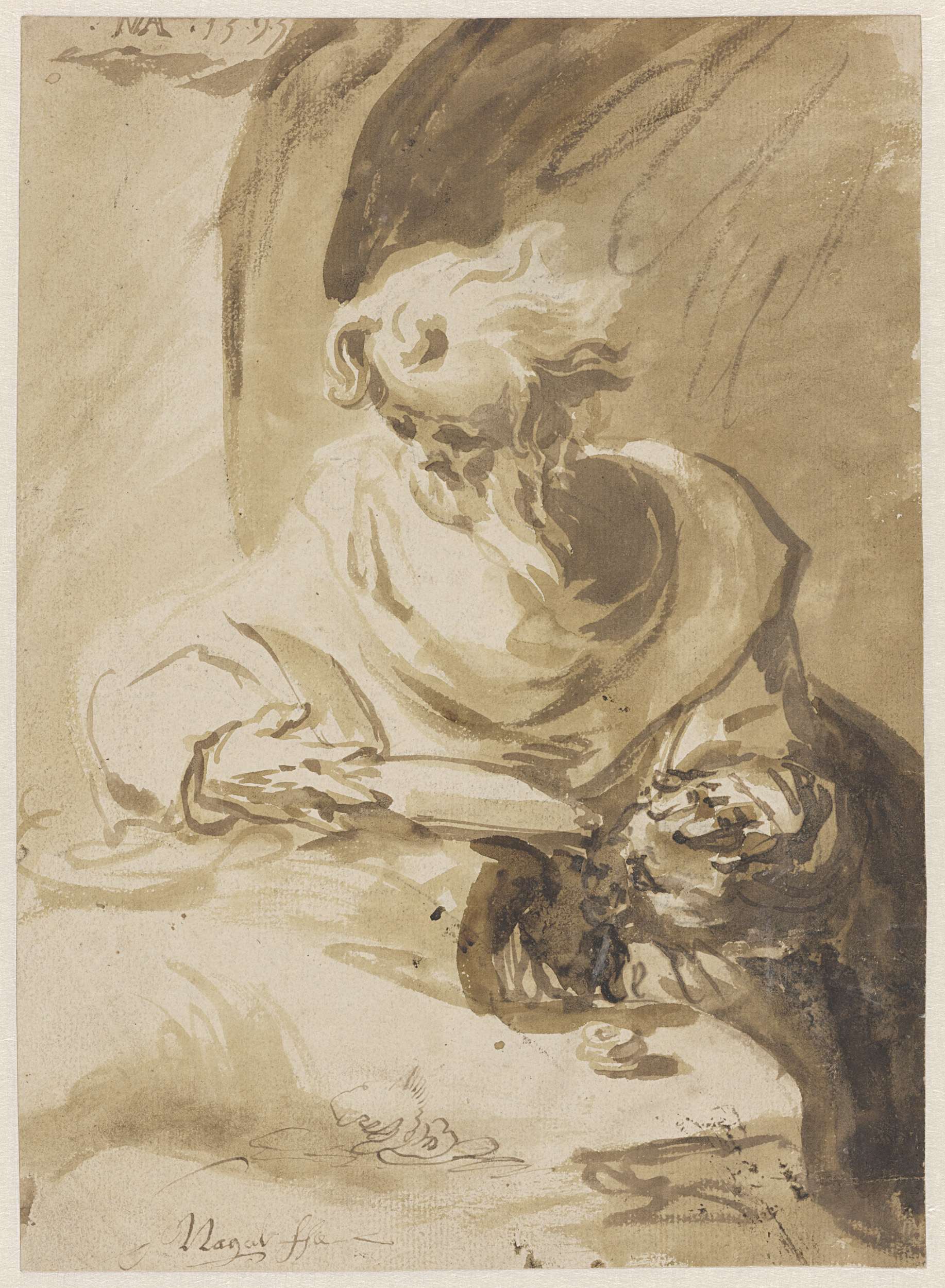 Net als het werk van Hans Mont hiernaast zijn ook tekeningen van Jan Nagel uiterst zeldzaam. Ook lijkt Nagel evenals zijn tijdgenoot geïnspireerd te zijn geweest door Italiaanse houtsneden. Bij deze heilige Hieronymus bereikte Nagel de effecten van licht en donker middels brede wassingen in verschillende tinten groenbruin en door het wit van het papier ...