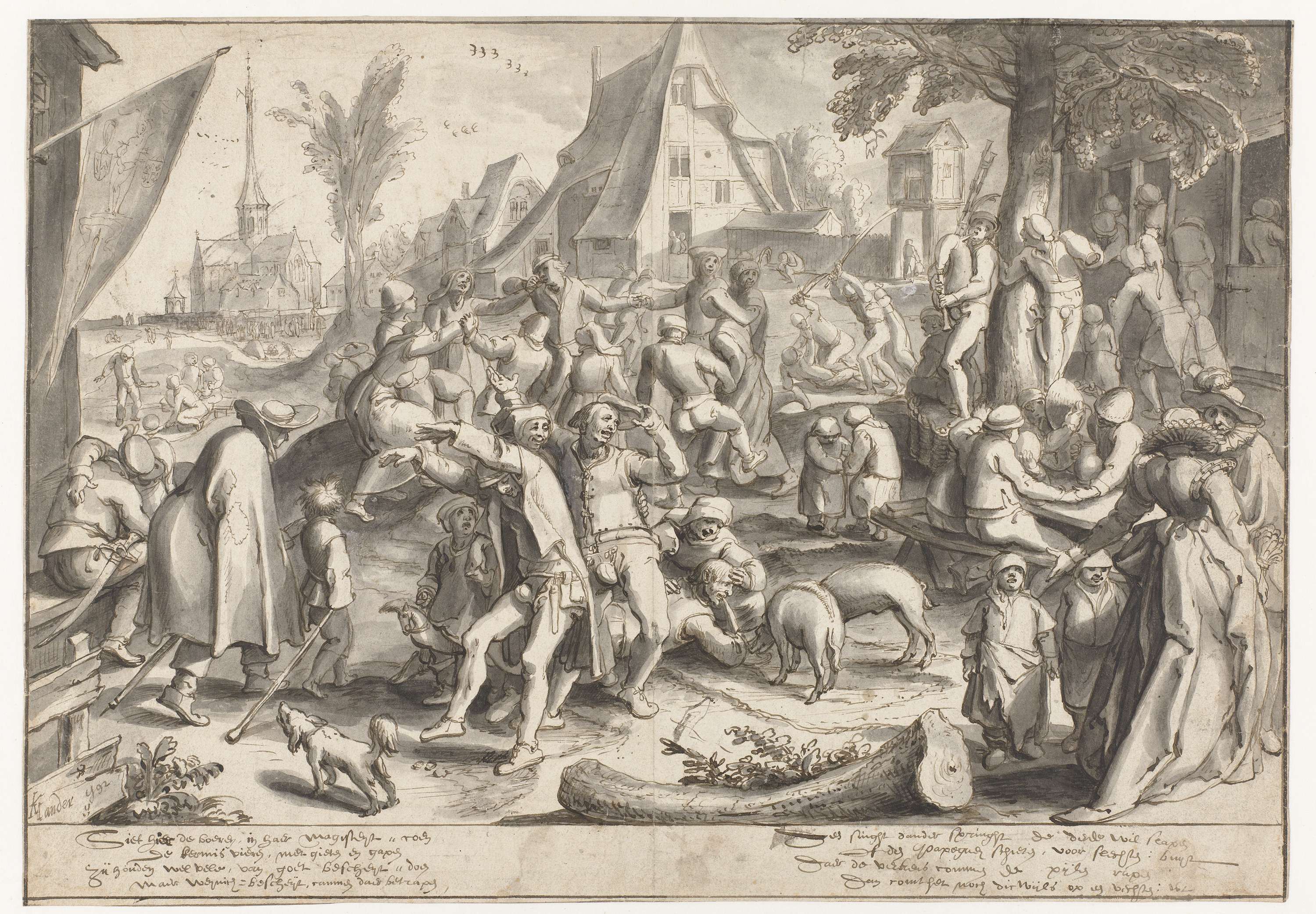 De vrolijke, dansende menigte vult het dorpsplein. Hier en daar loopt het wat uit de hand: links zit een stelletje innig verstrengeld, in het midden ligt een brakende man en op de achtergrond is een opstootje gaande. Het stedelijke paar rechts voorin vertegenwoordigt de afgunst van de toeschouwer. Desalniettemin stelt de tekenaar Karel van Mander ...