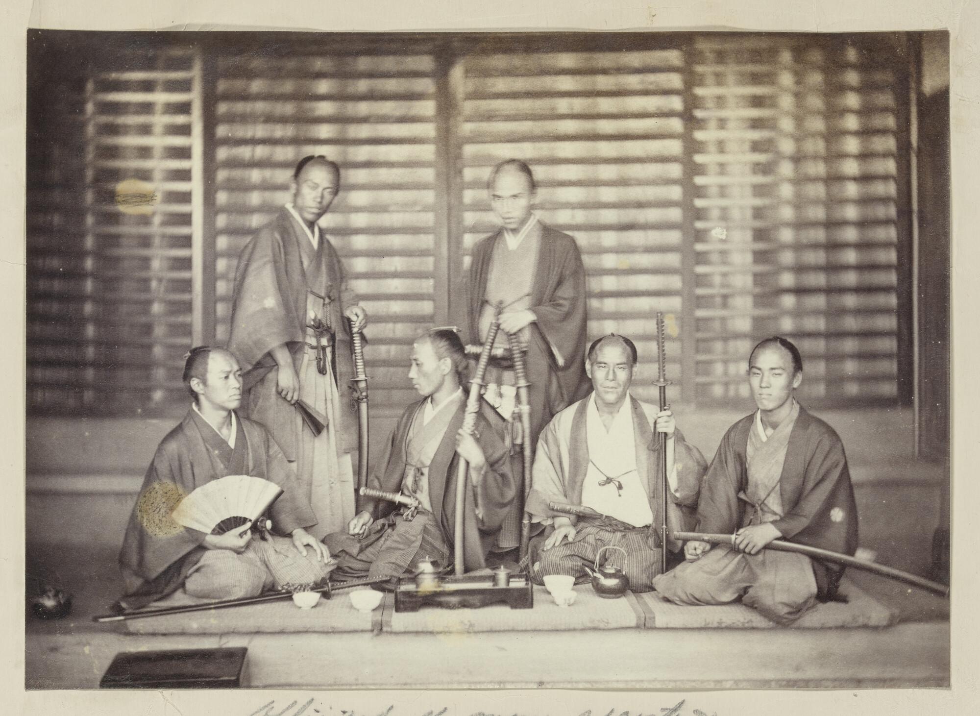 Groepsportret van zes Samurai. Zij maakten deel uit van de escorte van Dirk de Graeff van Polsbroek tijdens zijn bezoek aan Edo (Tokyo) in 1863.
