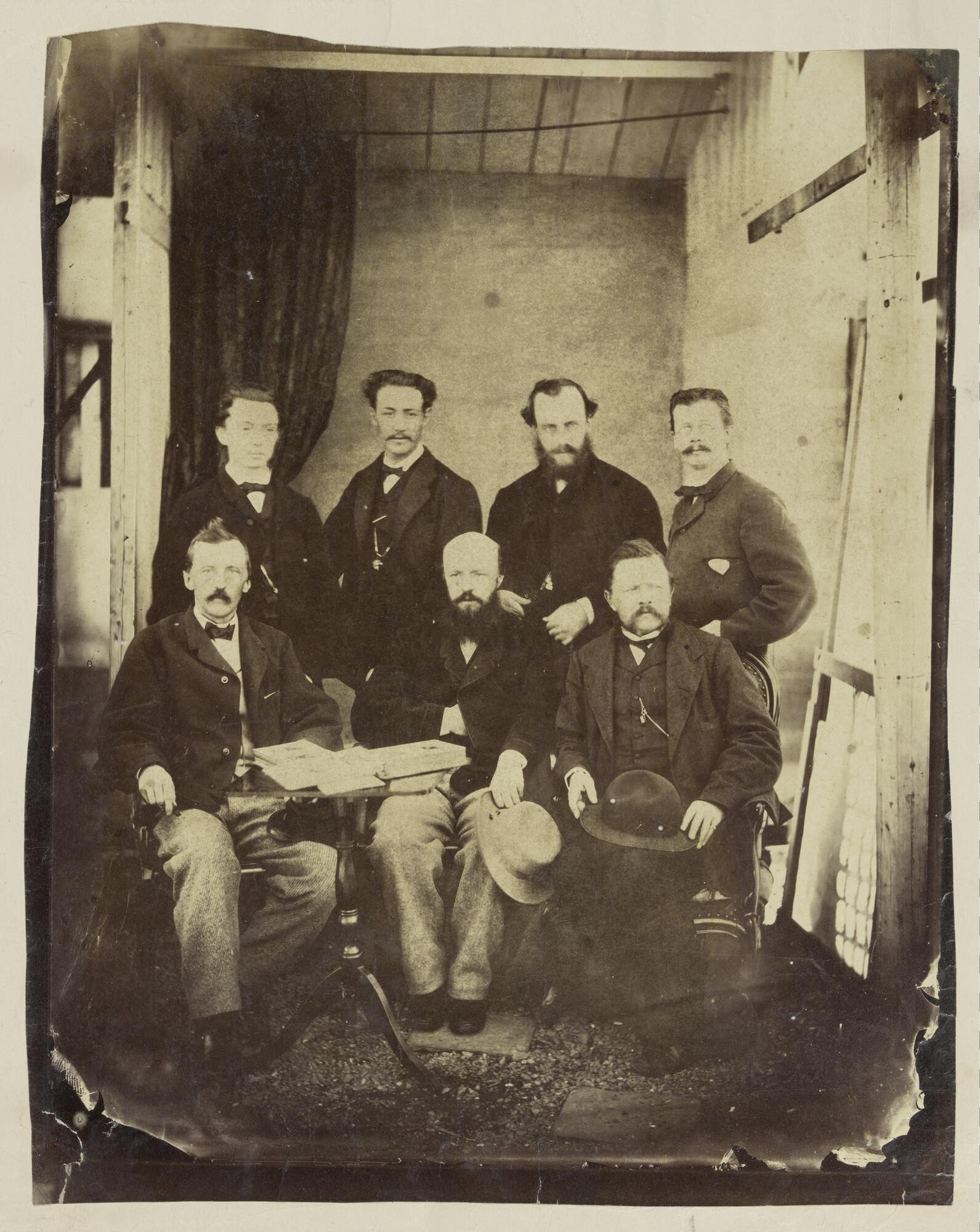 A group of Dutchmen consisting of, from left to right; the army physician and amateur photographer Toon Bauduin, superintendent of the Yōjōsho hospital and medical training facility in the port city of Nagasaki; the clerk Pieter Pistorius, employee of the Netherlands Trading Society (NHM); unknown; the merchant Albert Bauduin, agent of the NHM and Toon's ...