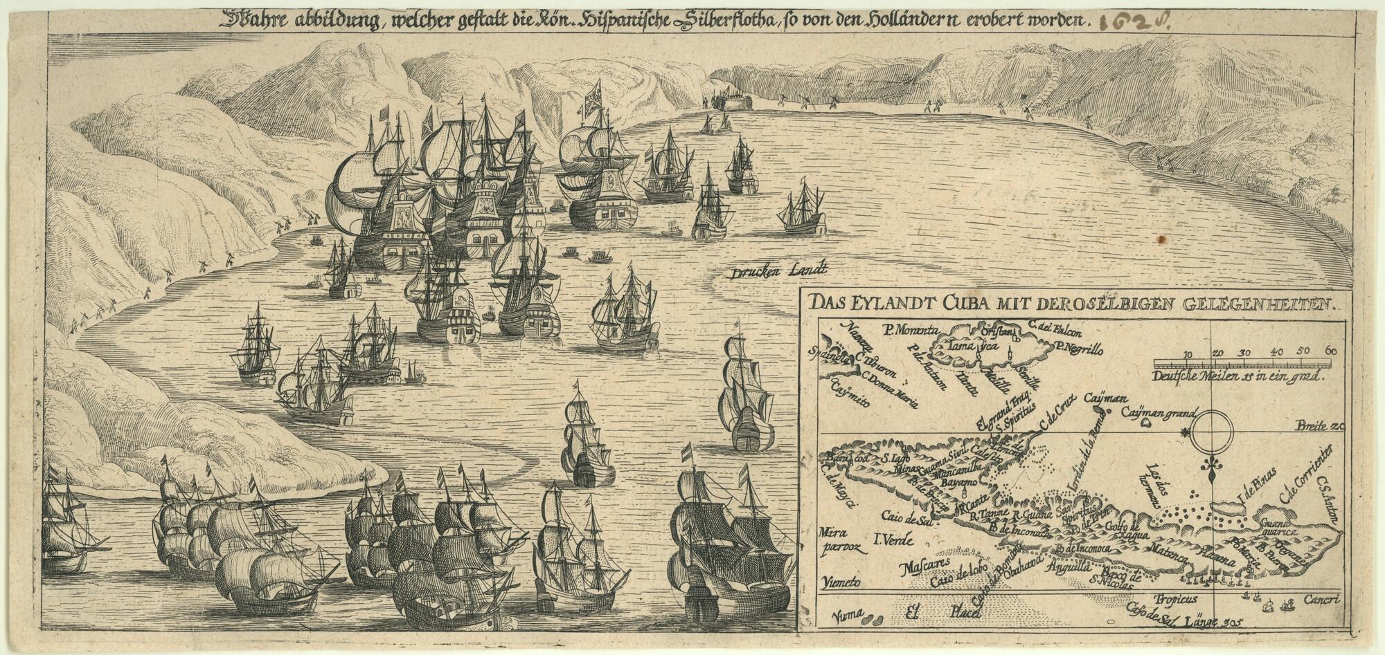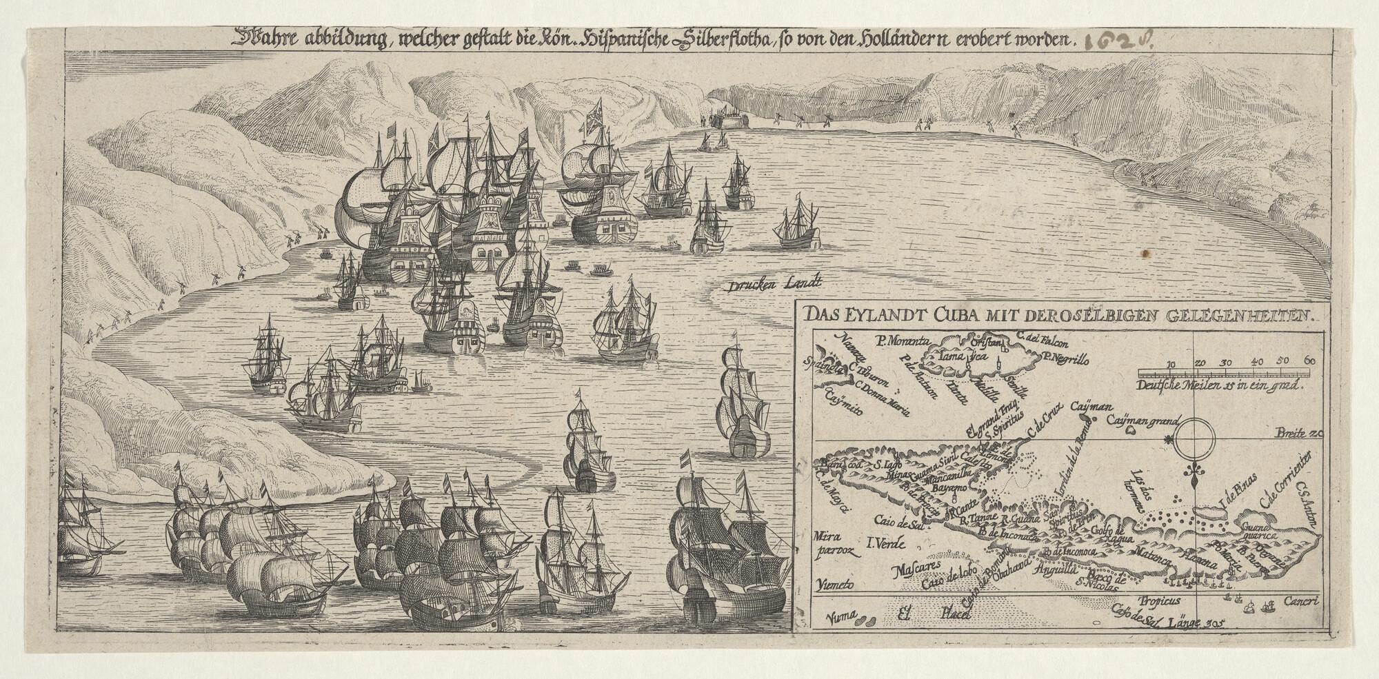 Verovering van de Zilvervloot door Piet Heyn, in de Baai van Matanca of Matanza, 1628, met rechtsonder een kaartje van Cuba.