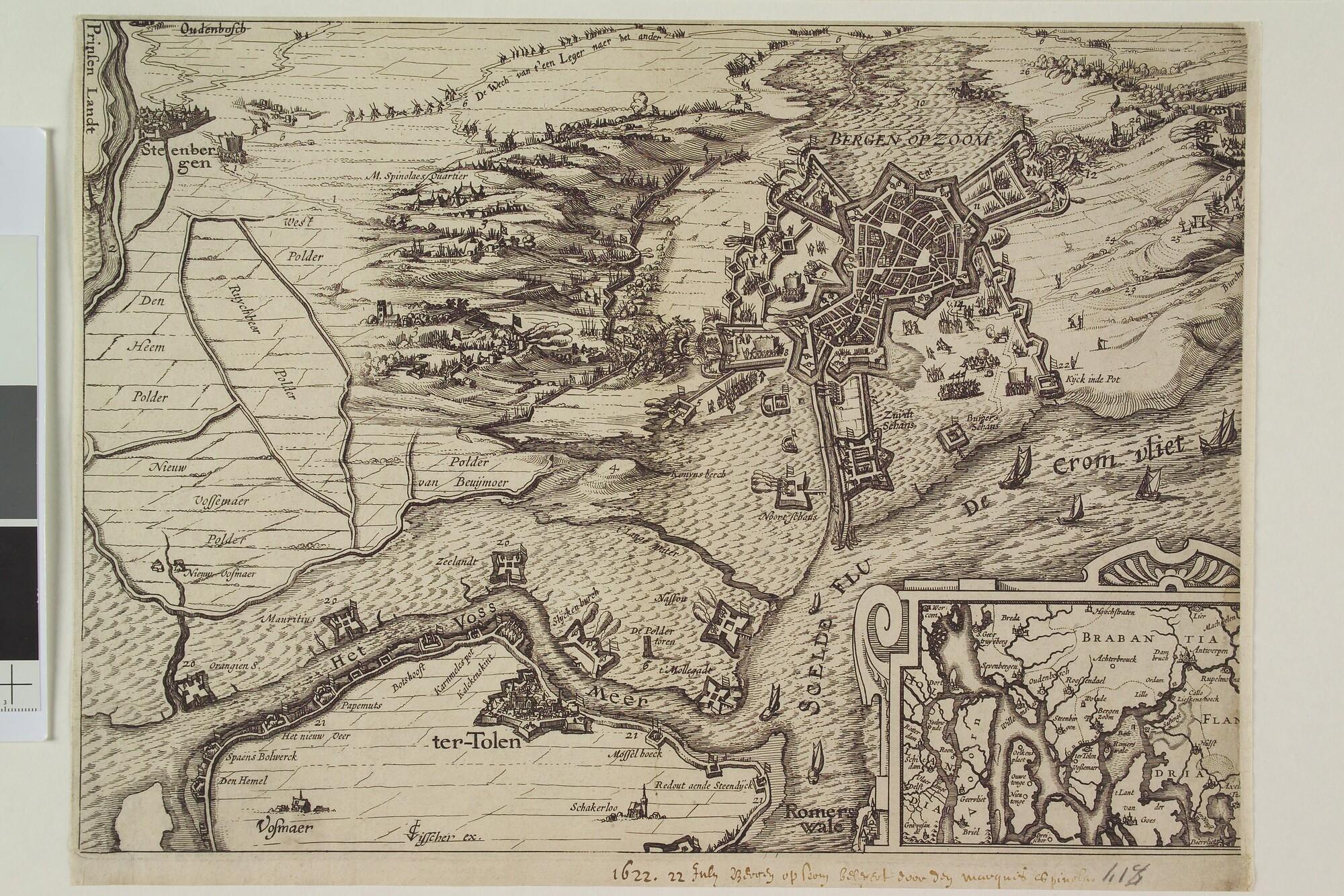 Plan van Bergen op Zoom en omstreken, met het beleg van Spinola, 1622; rechtsonder als inzet een kaartje van het omringende gebied.