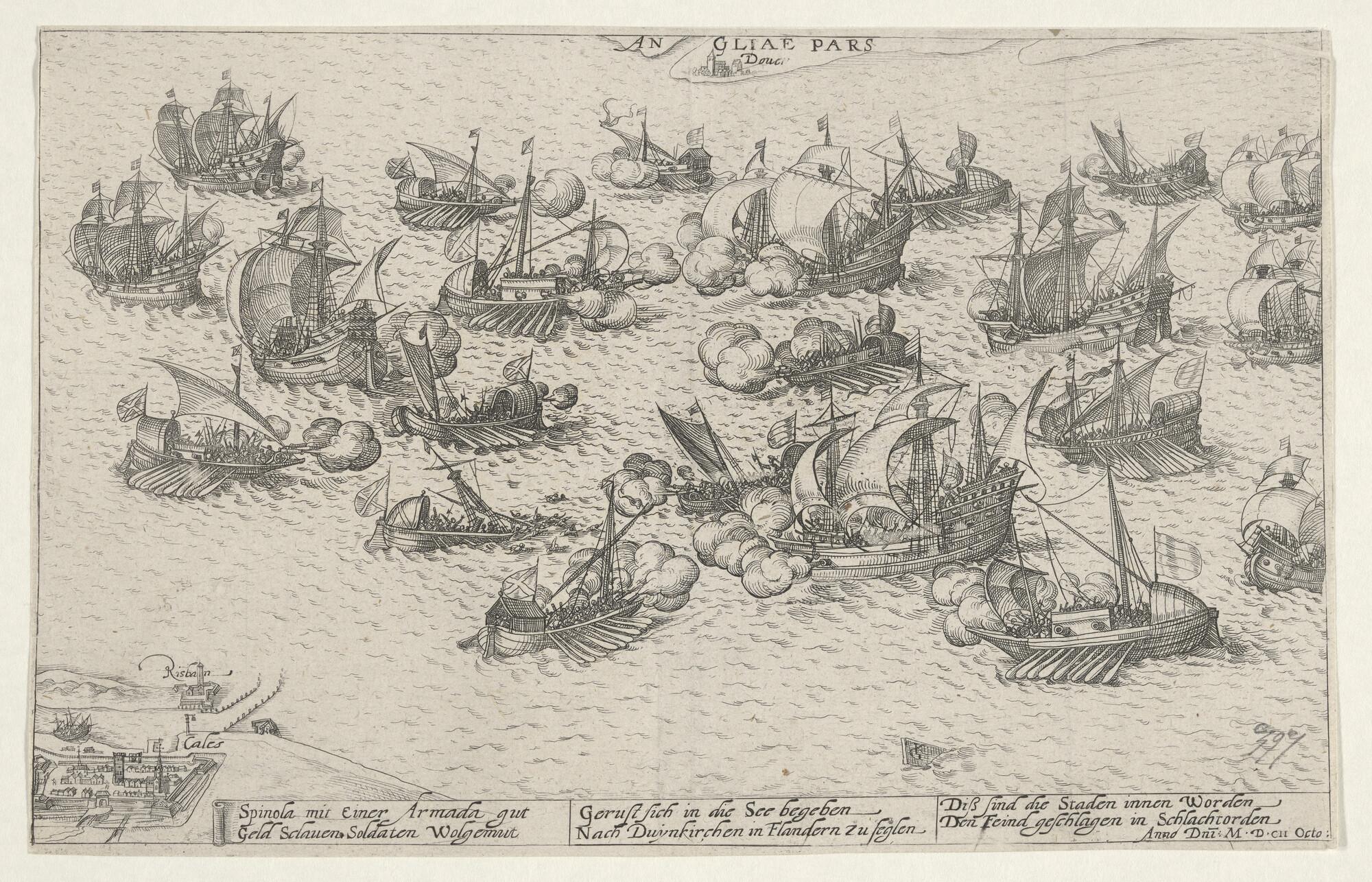 Vernieling van zes Spaanse galeien in het Nauw van Calais, door Hollandse en Engelse schepen, 3 oktober 1602.