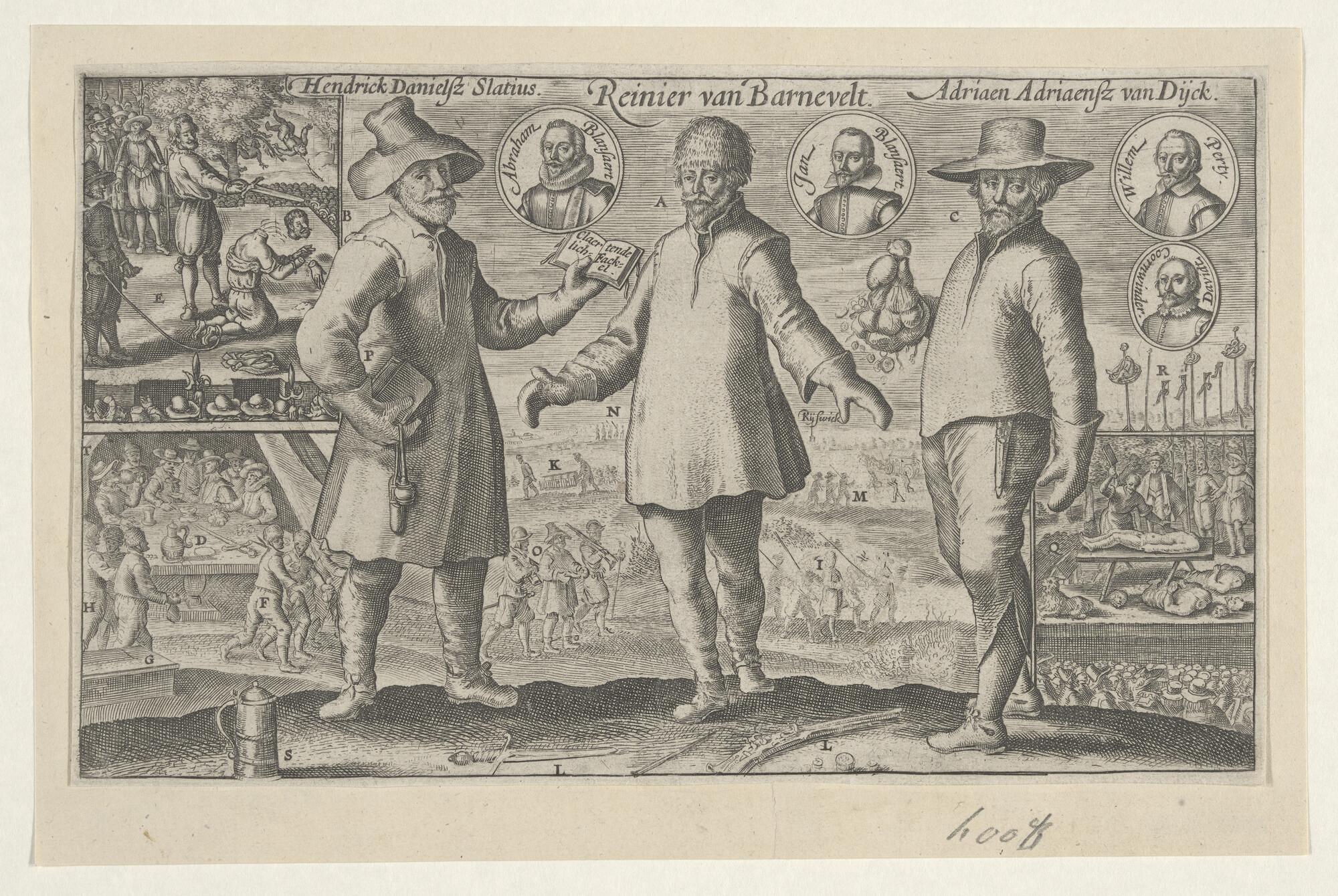 Afbeelding van de drie samenzweerders tegen Prins Maurits, Reinier van Barnevelt, Hendrick Slatius en Adriaen van Dijck, met op de achtergrond verschillende gebeurtenissen rond hun executie, 1623.