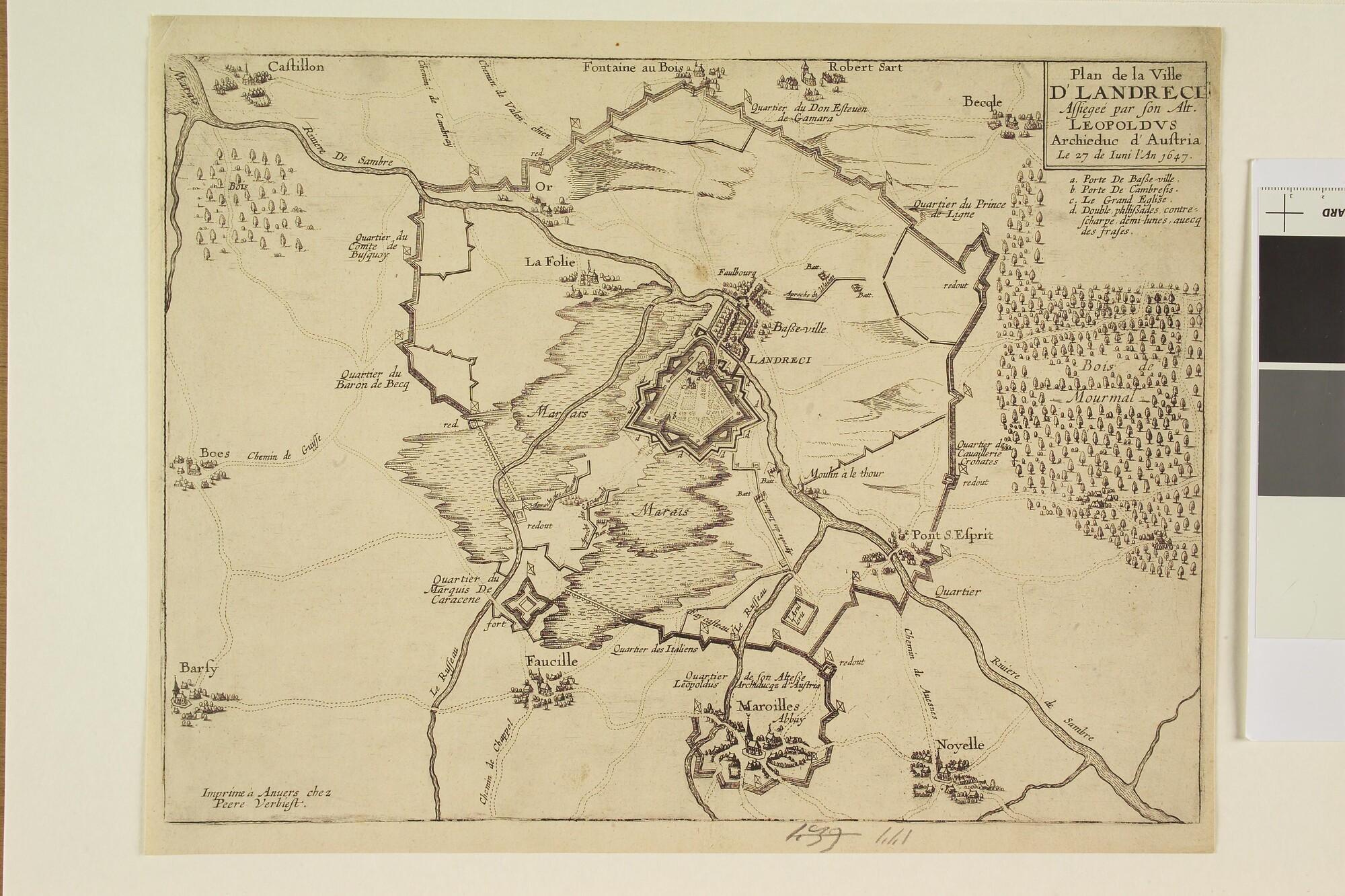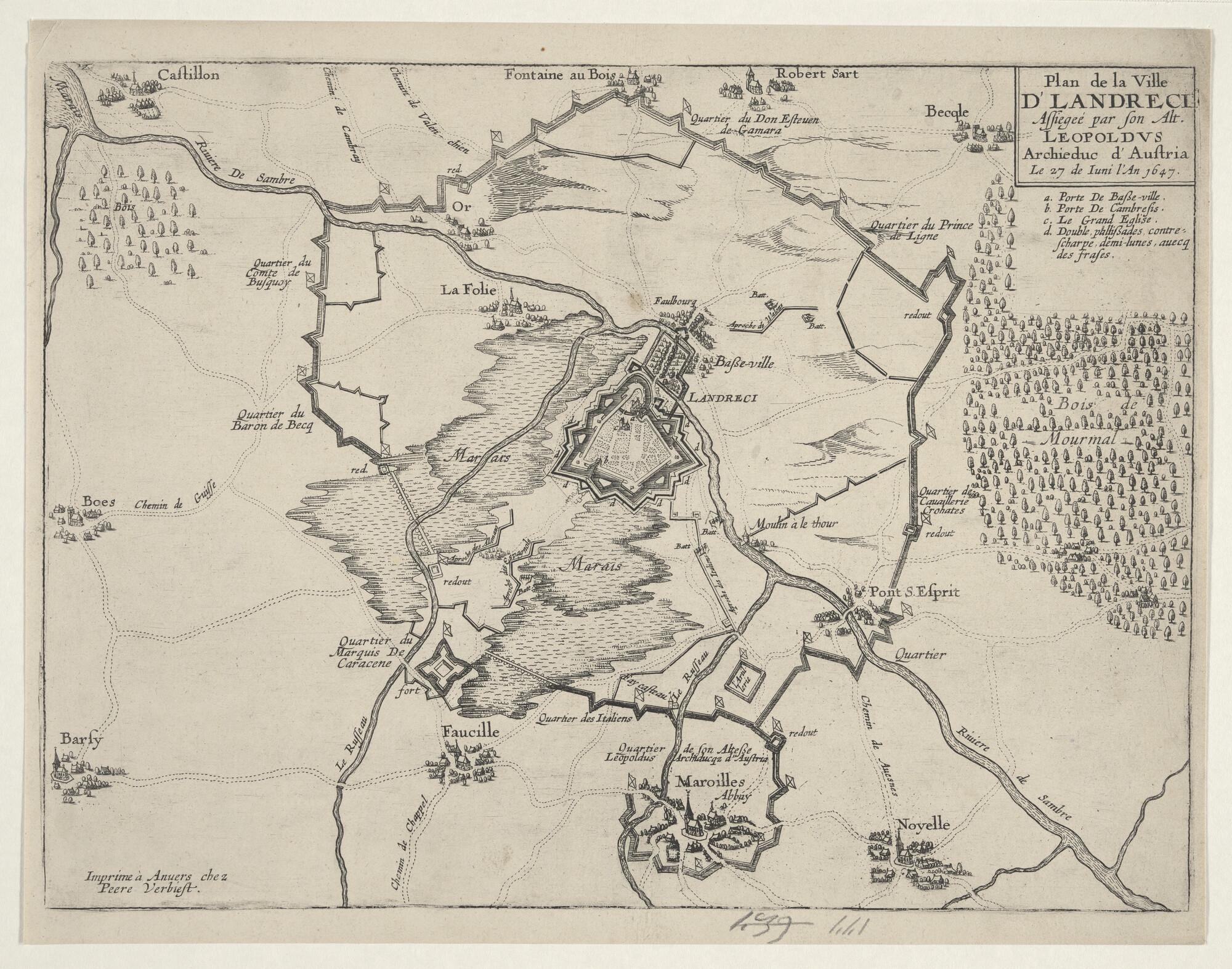 Kaart van de belegering van de Franse stad Landreci aan de rivier de Sambre, door aartshertog Leopold van Oostenrijk, 27 juni 1647.
