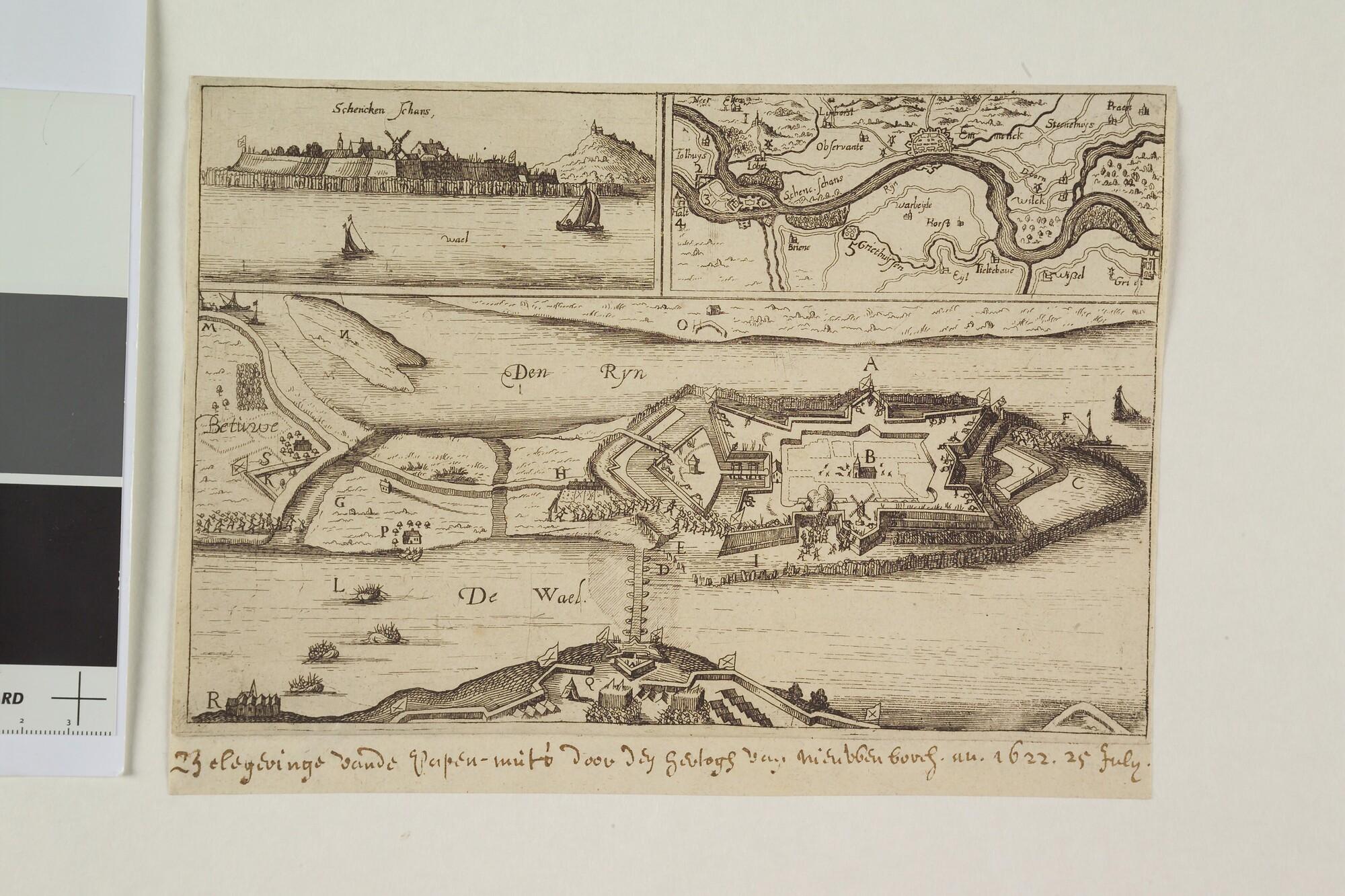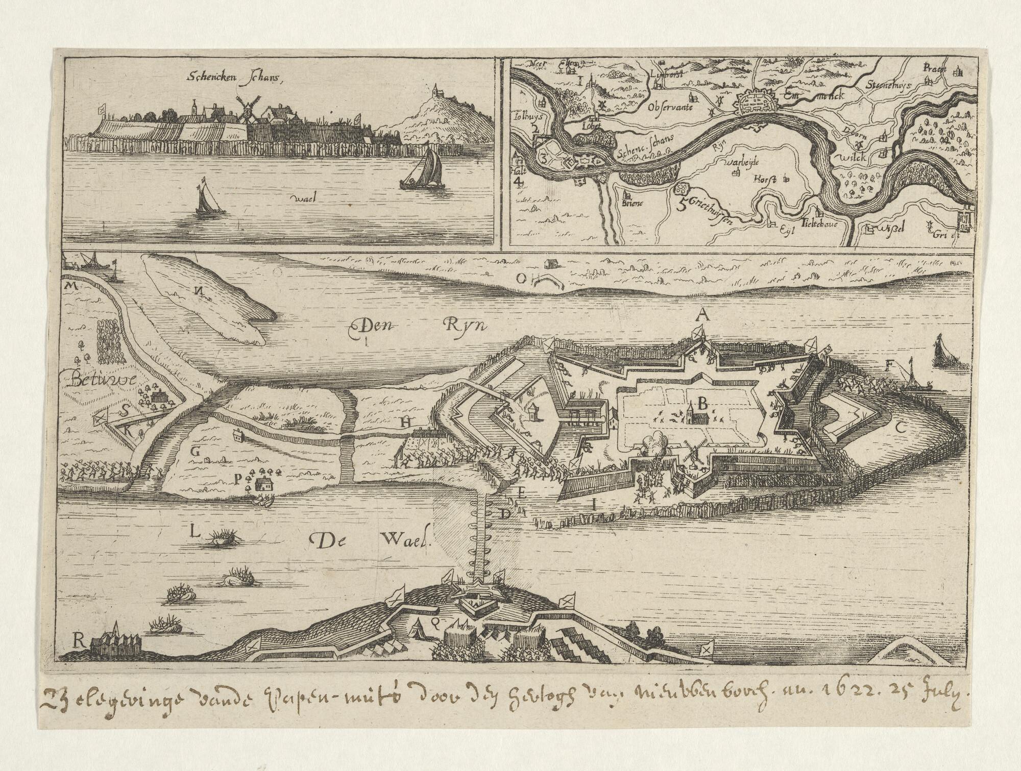 Het fort Schenkenschans op de splitsing van Rijn en Waal, mogelijk tijdens de verovering door de Spanjaarden in 1635.