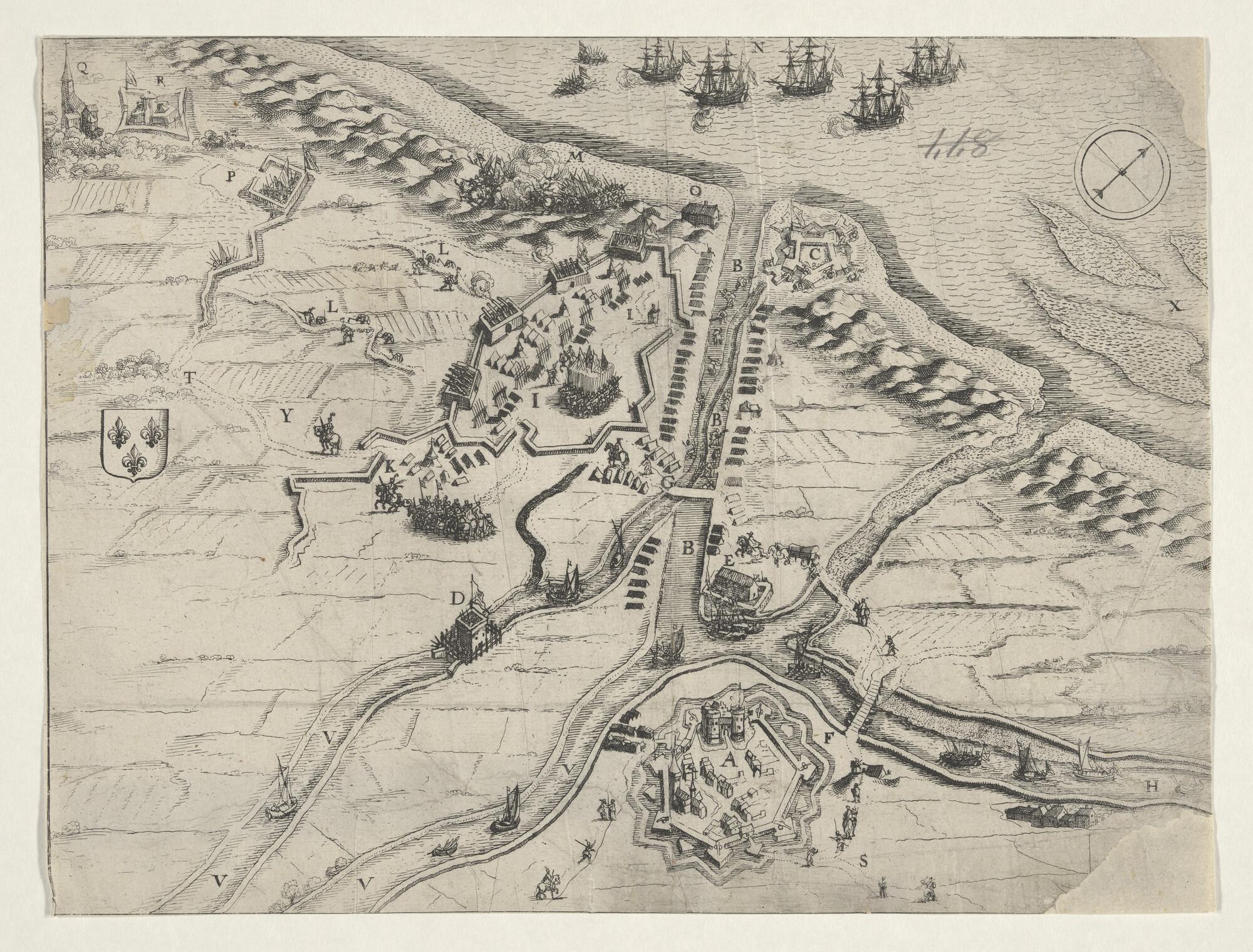 Vogelvluchtkaart van een kustgebied met forten en waterwegen en militaire activiteiten daartussen (mogelijk de Vlaamse kust); voor de kust vijf oorlogsschepen en twee sloepen, links een wapen met drie lelies.