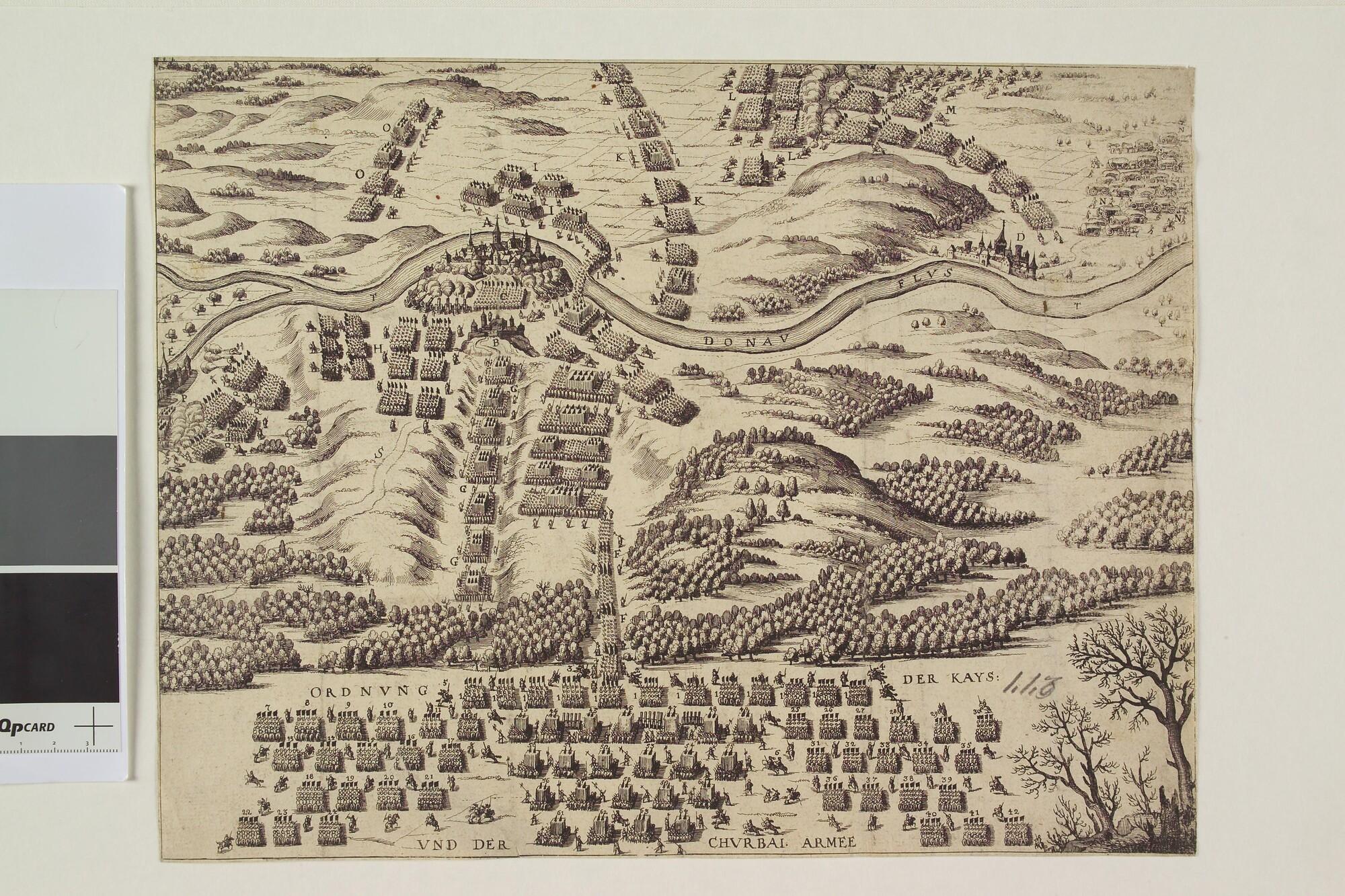 Vogelvluchtkaart van een oprukkend leger van keizerlijke en Beierse (?) troepen naar versterkt stadje aan de Donau.