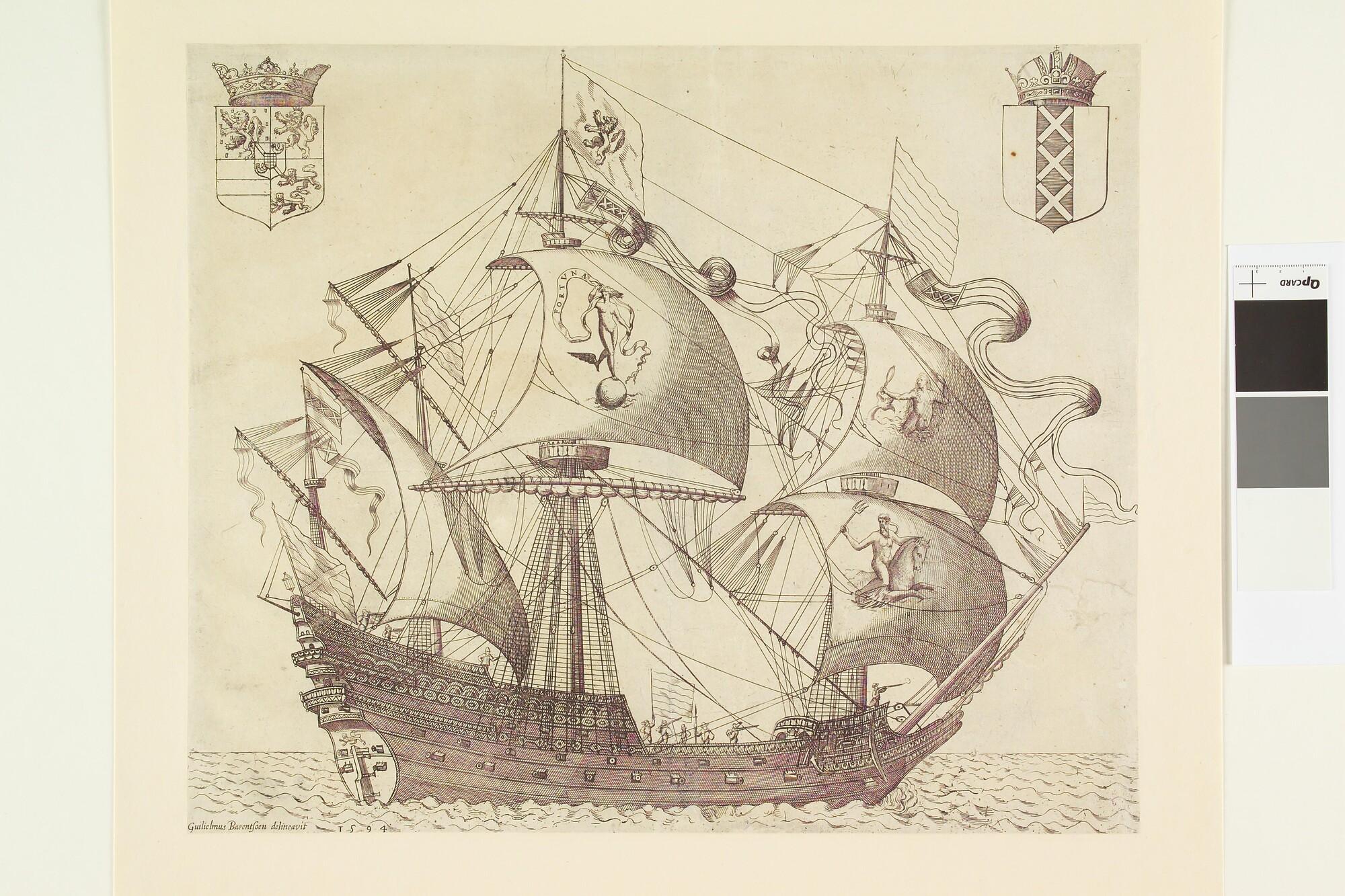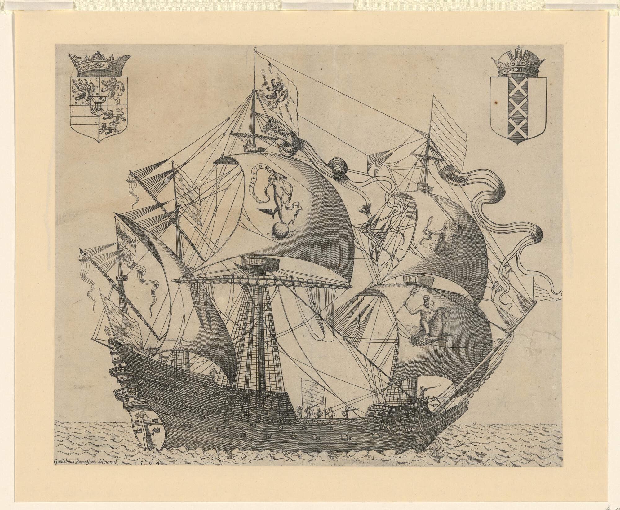 De Fortuna, een viermastspiegelschip van vijftig stukken; links het wapen van Willem van Oranje Maurits, rechts het stadswapen van Amsterdam, op het marszeil van de grote mast een afbeelding van Vrouwe Fortuna, op andere zeilen een zeenimf en Neptunus. Aan de masten wimpels met het Amsterdamse stadswapen, aan de druilmast een vlag met hetzelfde wapen, ...