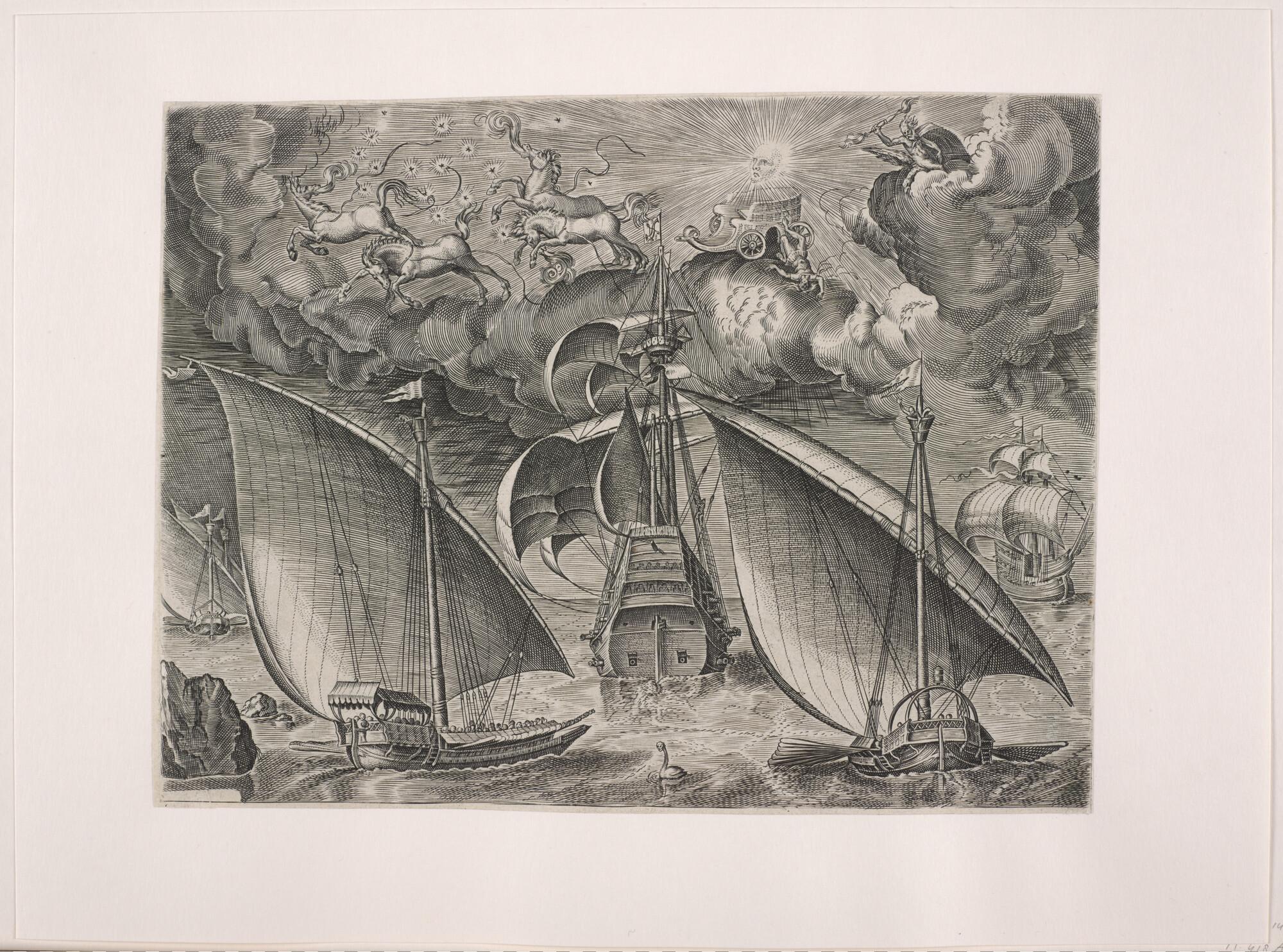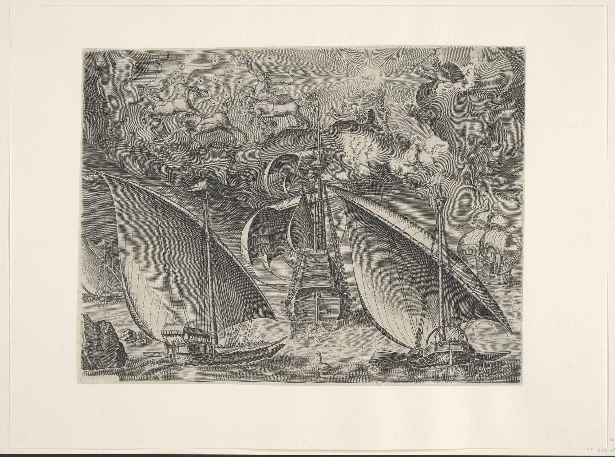 Uit de serie 'Oorlogsschepen': oorlogsschip, driemaster, op de spiegel gezien, omgeven door drie galeien en een tweemaster; daarboven een allegorische voorstelling met paarden en goden (Neptunus en Jupiter?).