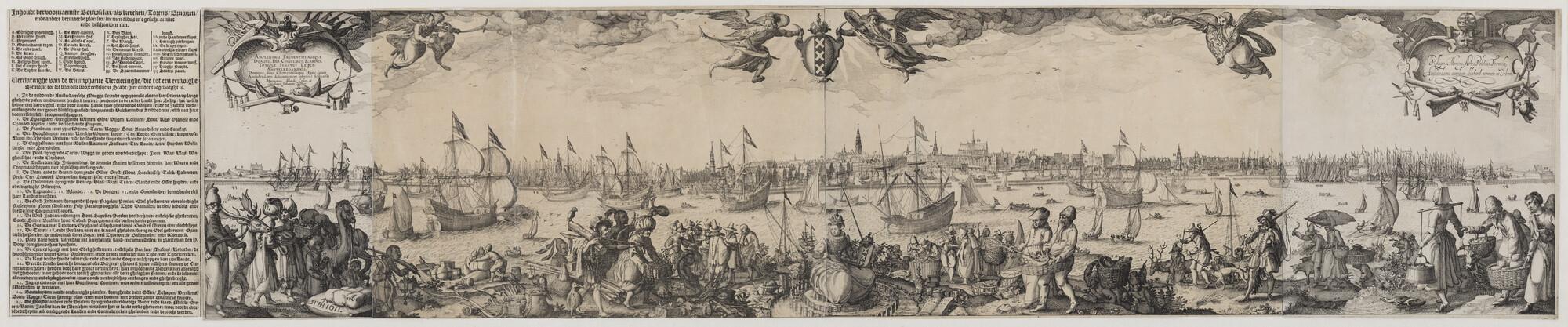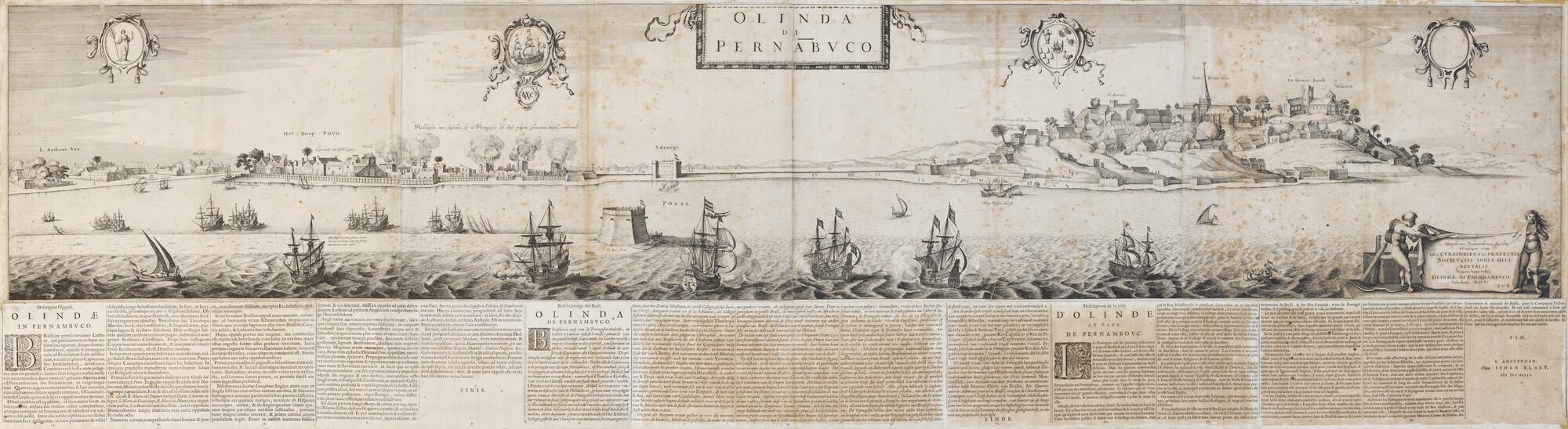 Olinda di Pernabvco. Gezicht op I Antonio Vaz, Povo, Recife en Olinda in Brazilië. Profiel in vier bladen, met onder tekst in boekdruk met een beschrijving van de stad in het Latijn, Nederlands en Frans in 5 bladen, met opdracht aan bewindhebbers van de West-Indische Compagnie in een cartouche rechtsonder. Bovenin zijn cartouches met, van ...