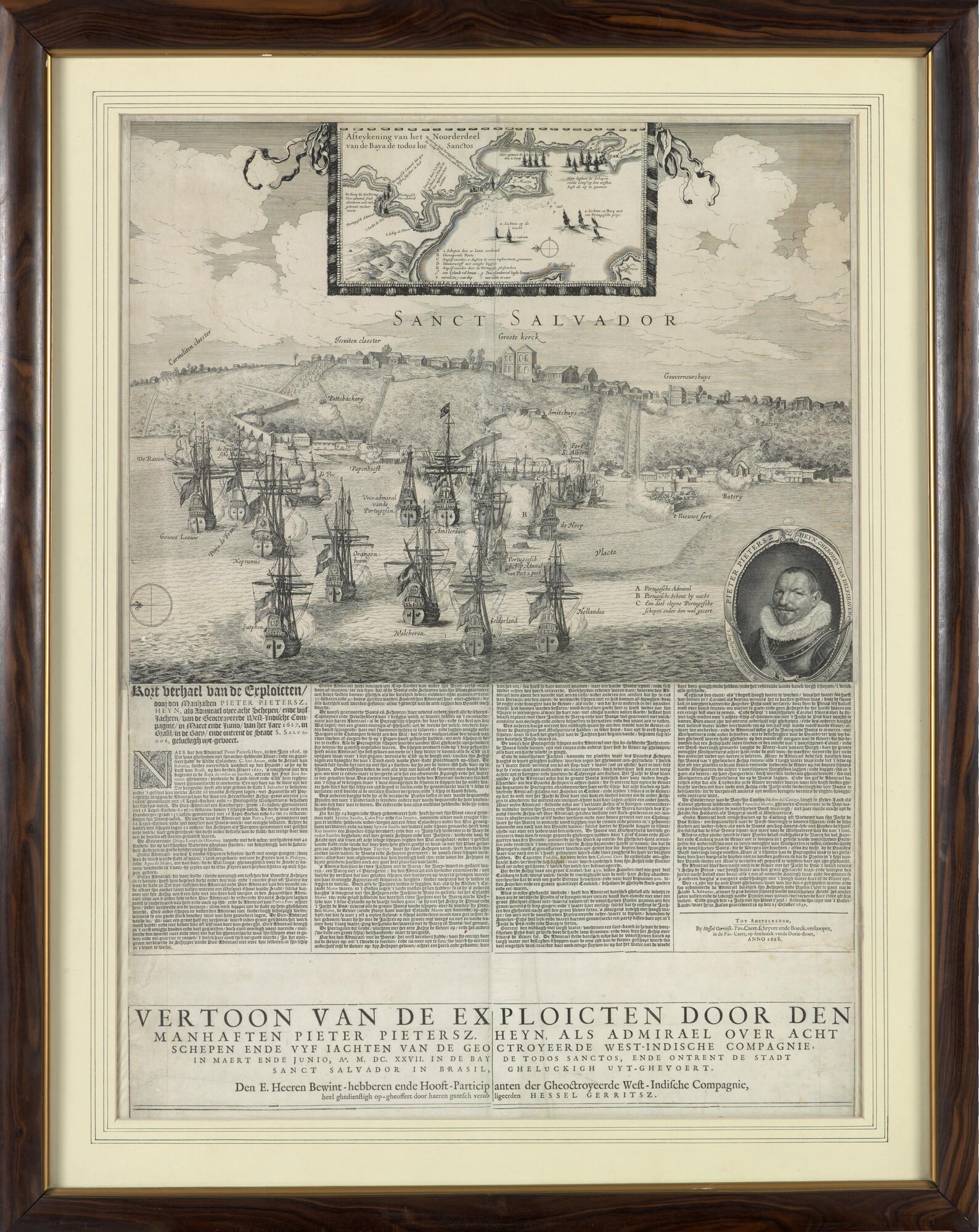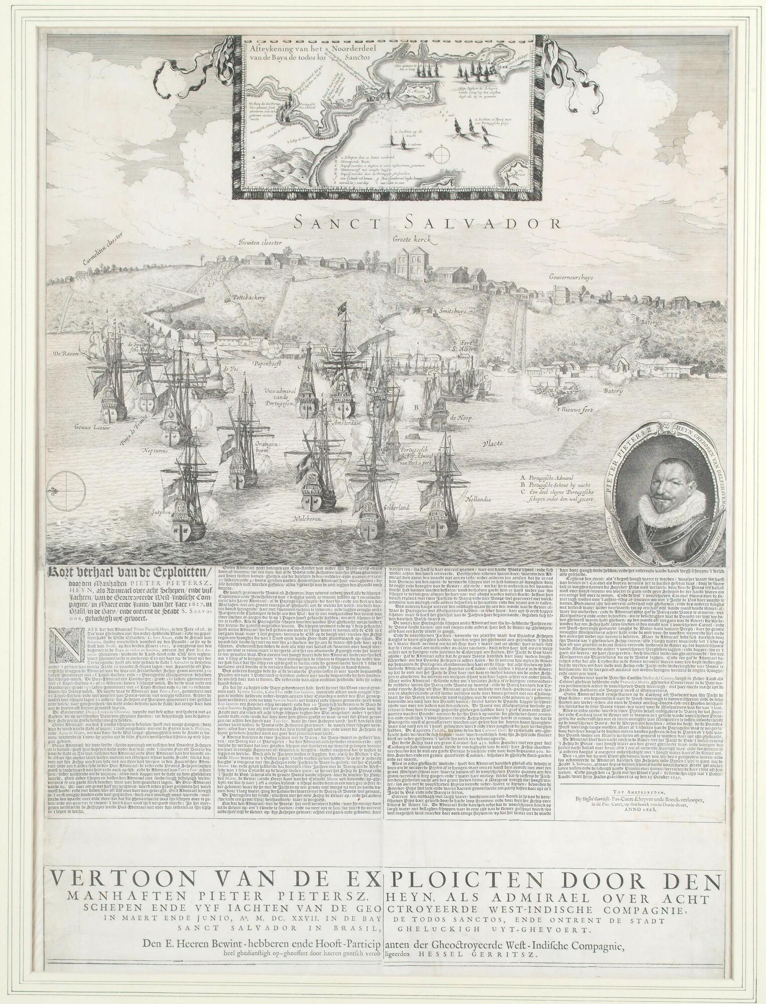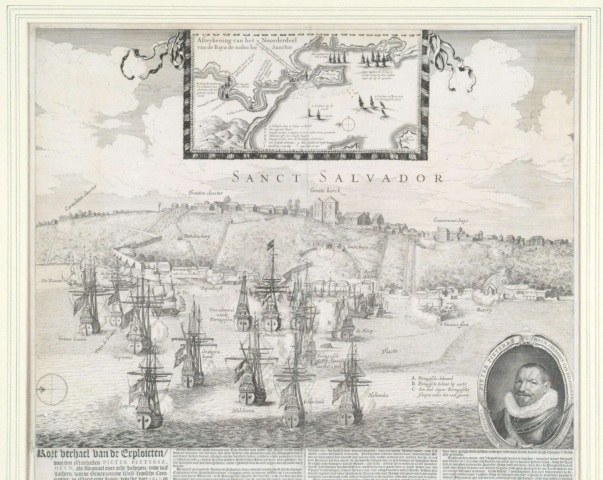 Prent, acties van admiraal Piet Hein tegen de Portugezen in de Allerheiligenbaai in Brazilië, maart en juni 1627: gezicht op de baai, daarboven een kaart van de baai, rechtsonder portret van Piet Hein en onder een gedrukte toelichting. Tweede staat van de prent. In lijst.
