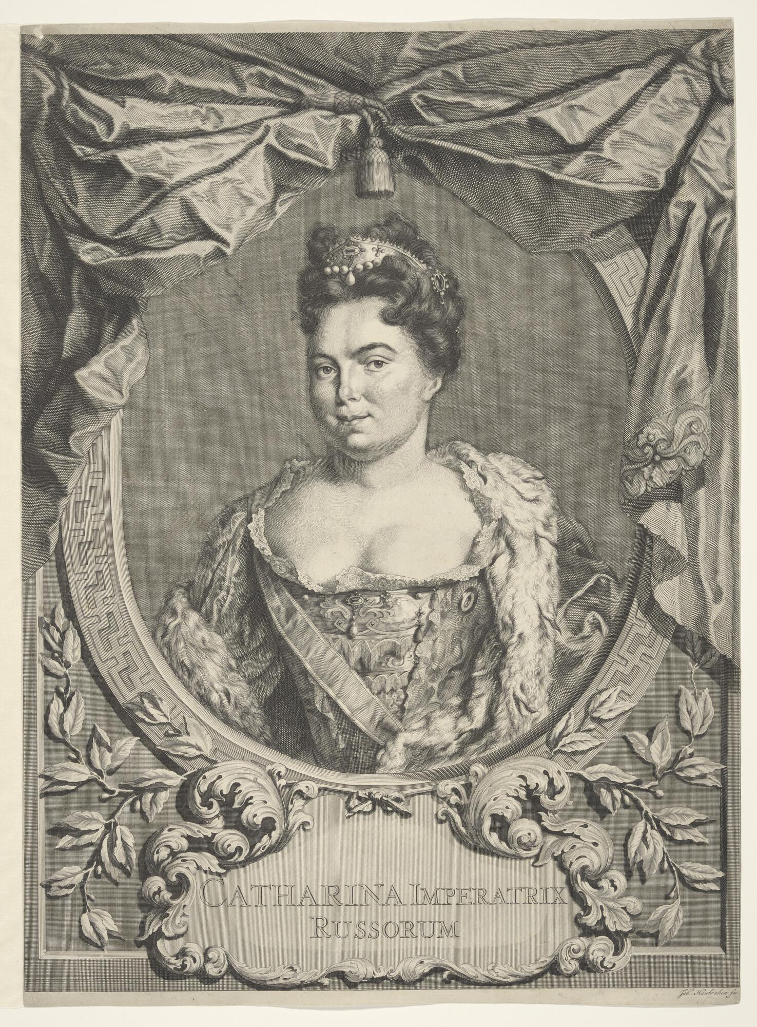 Portret van tsarina Catharina II van Rusland; borstbeeld van voren, in hermelijnen mantel.