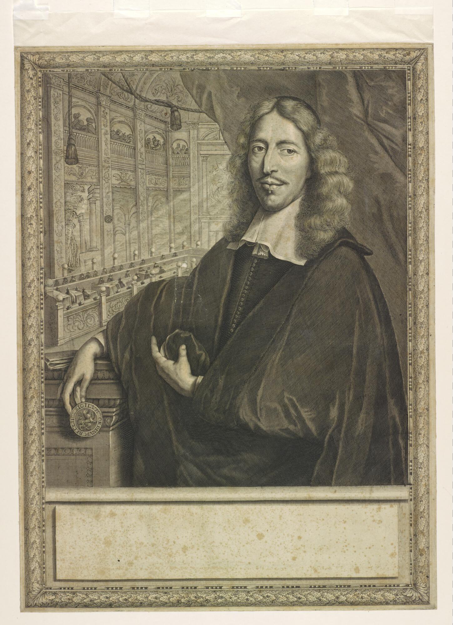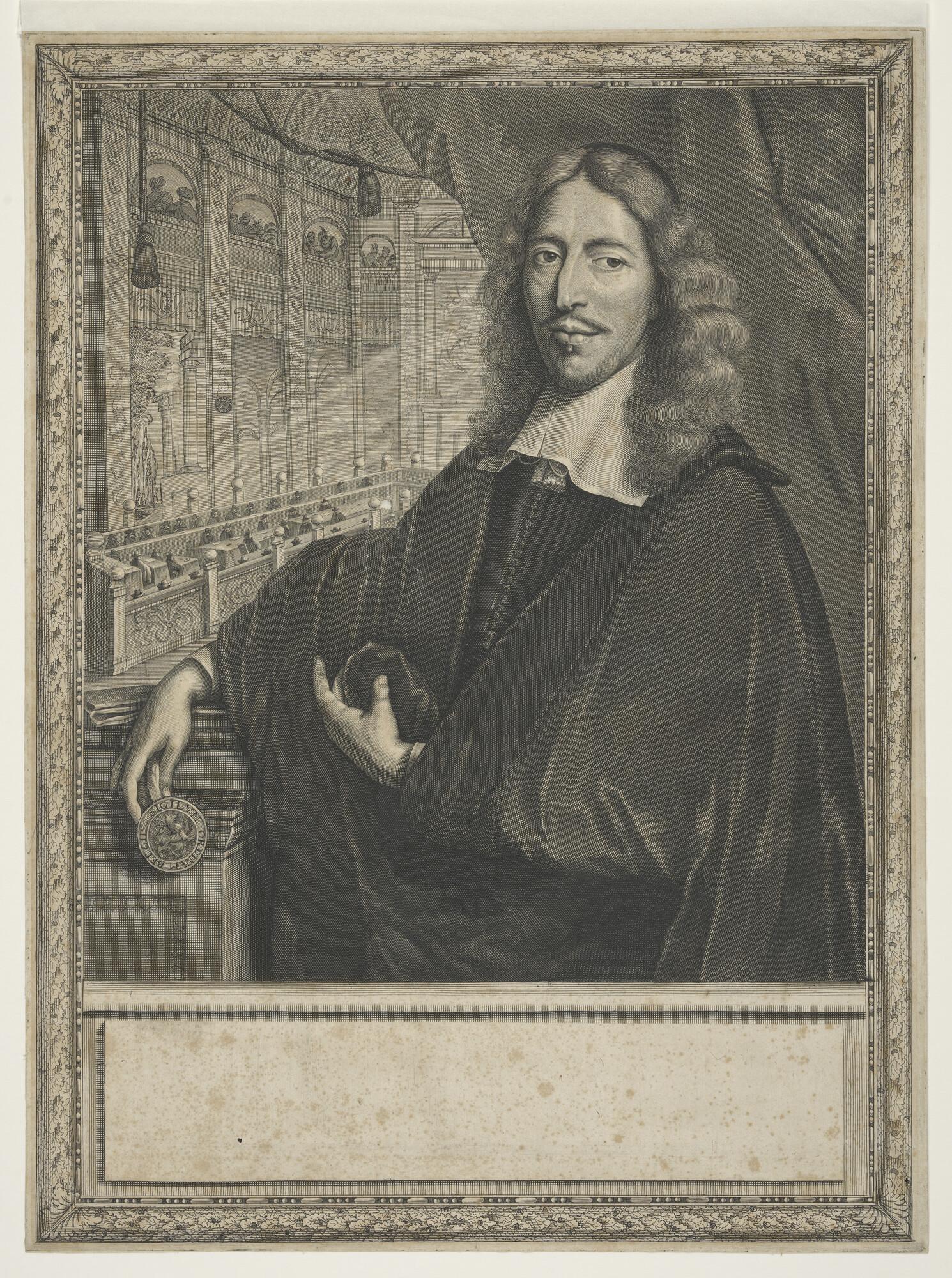 Portret van Johan de Witt, met het zegel van Holland in de linkerhand en de vergaderzaal van de Staten van Holland op de achtergrond, prent voor de letter