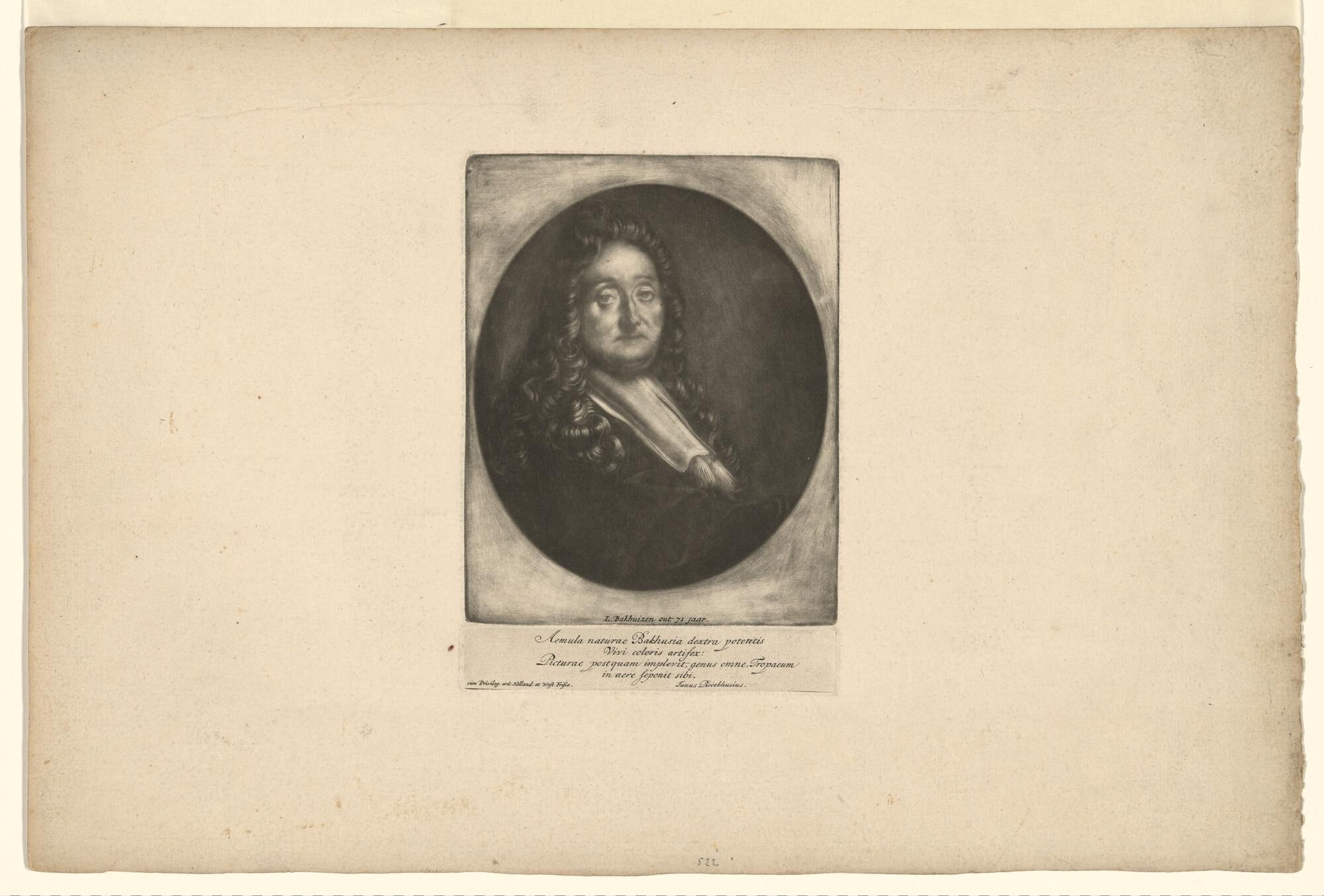 Portret van Ludolf Backhuysen, toevoeging aan de serie D'Y Stroom en Zeegezichten, met onderschrift in het Latijn door Jan van Broeckhuysen.