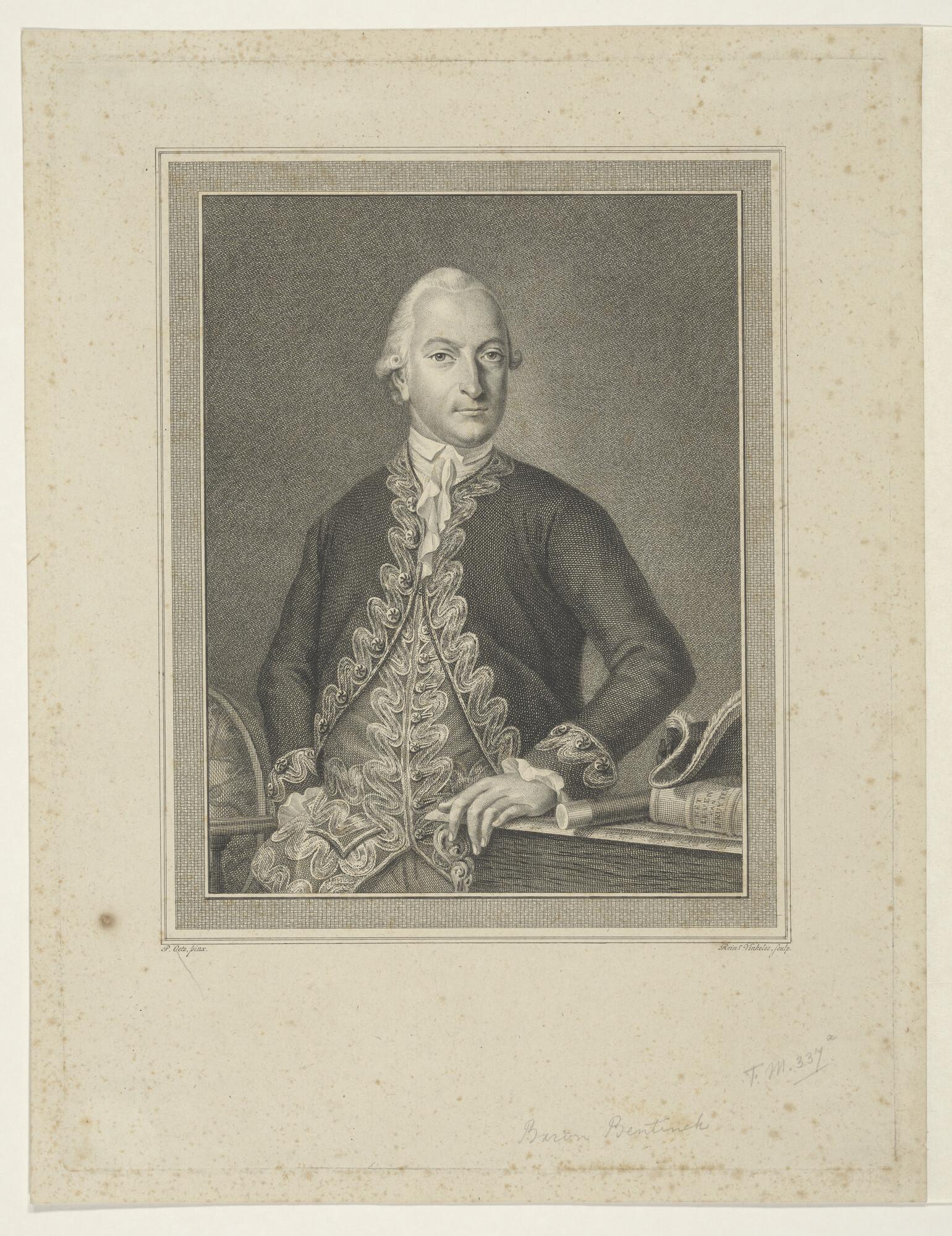 Portret van Wolter Jan Gerrit baron Bentinck; kniestuk van voren bij een tafel, waarop 'Het Leven van De Ruyter'.