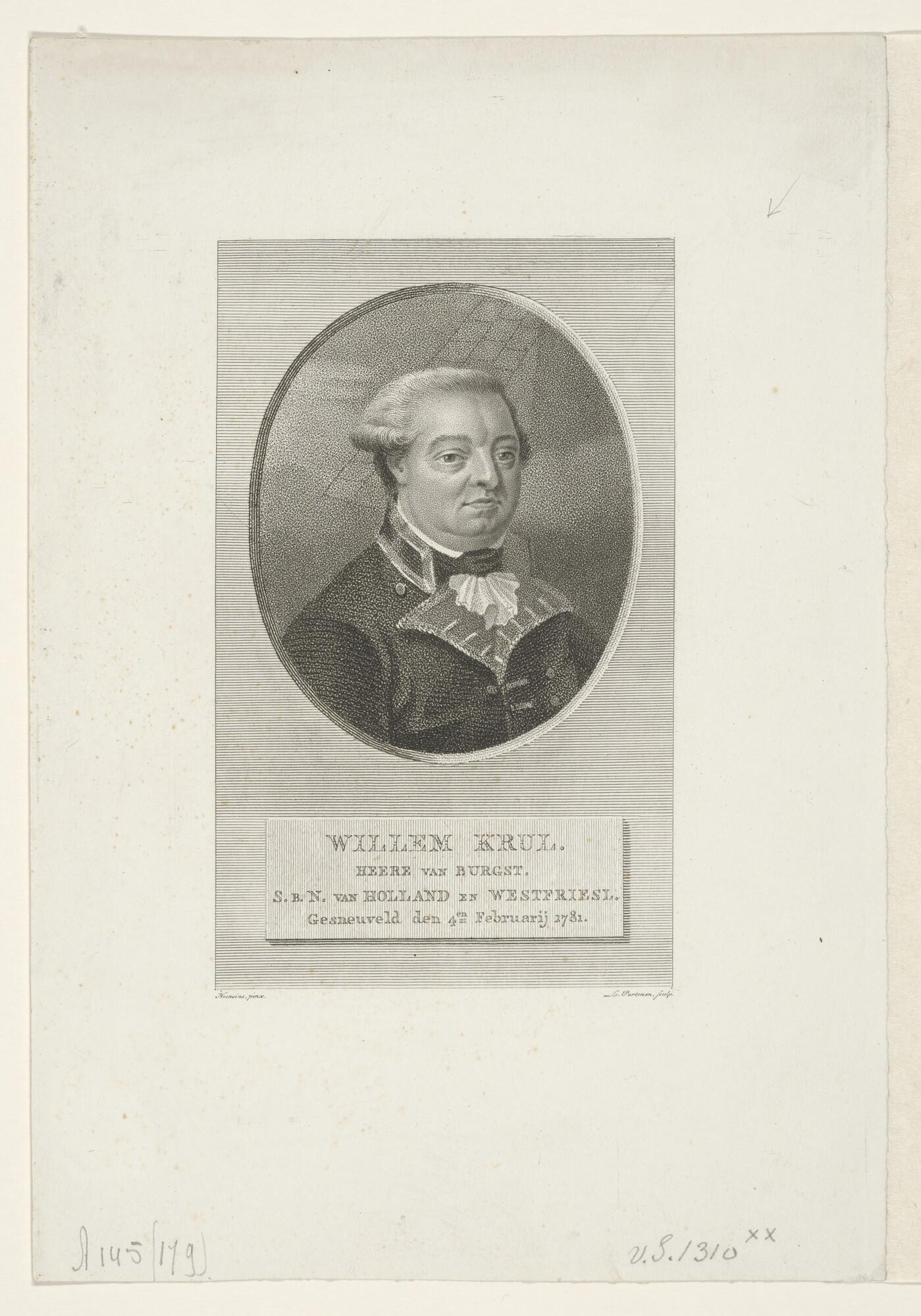 Portret van Schout-bij-Nacht Willem Krul, Heere van Burgst, borstbeeld naar rechts in ovaal.