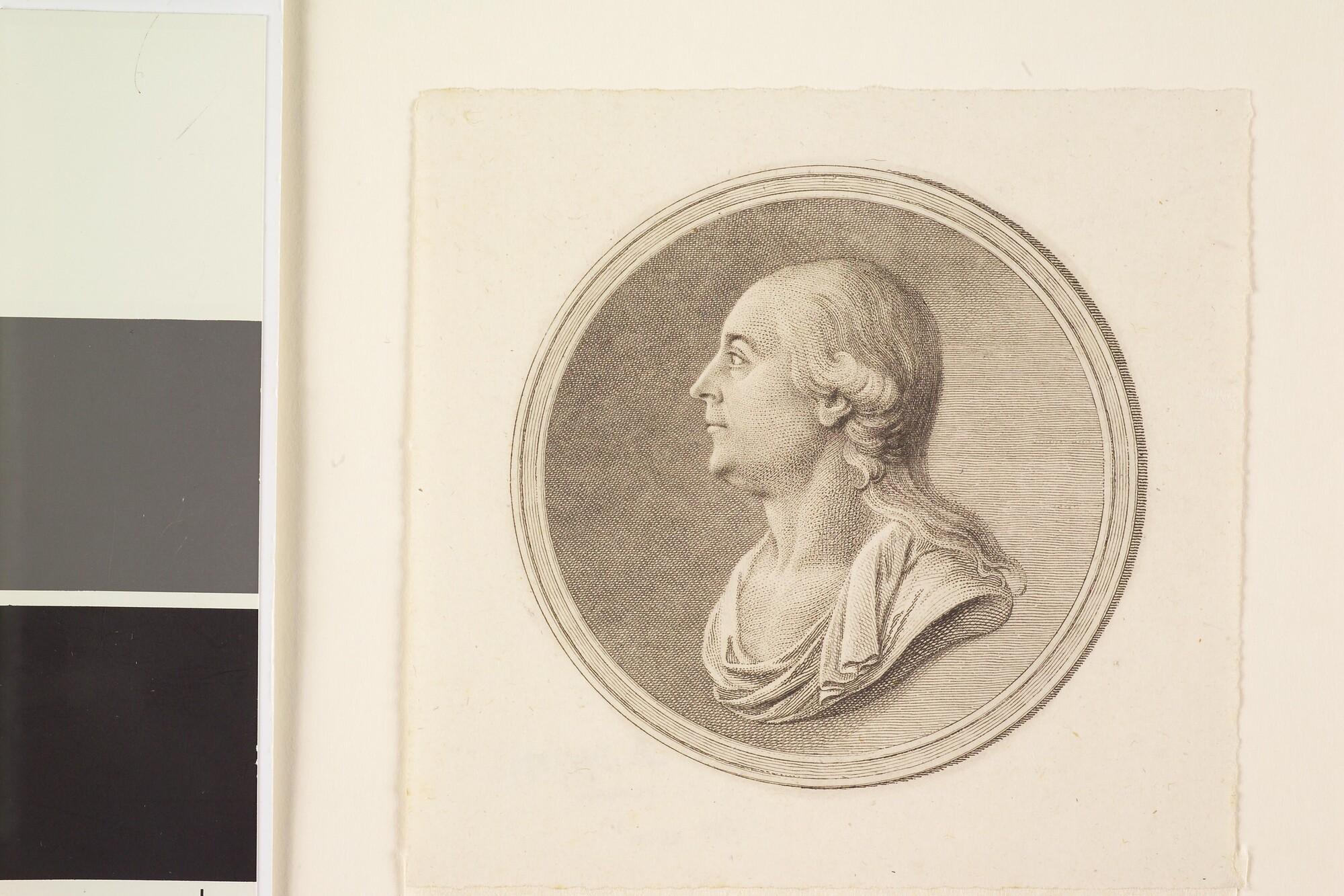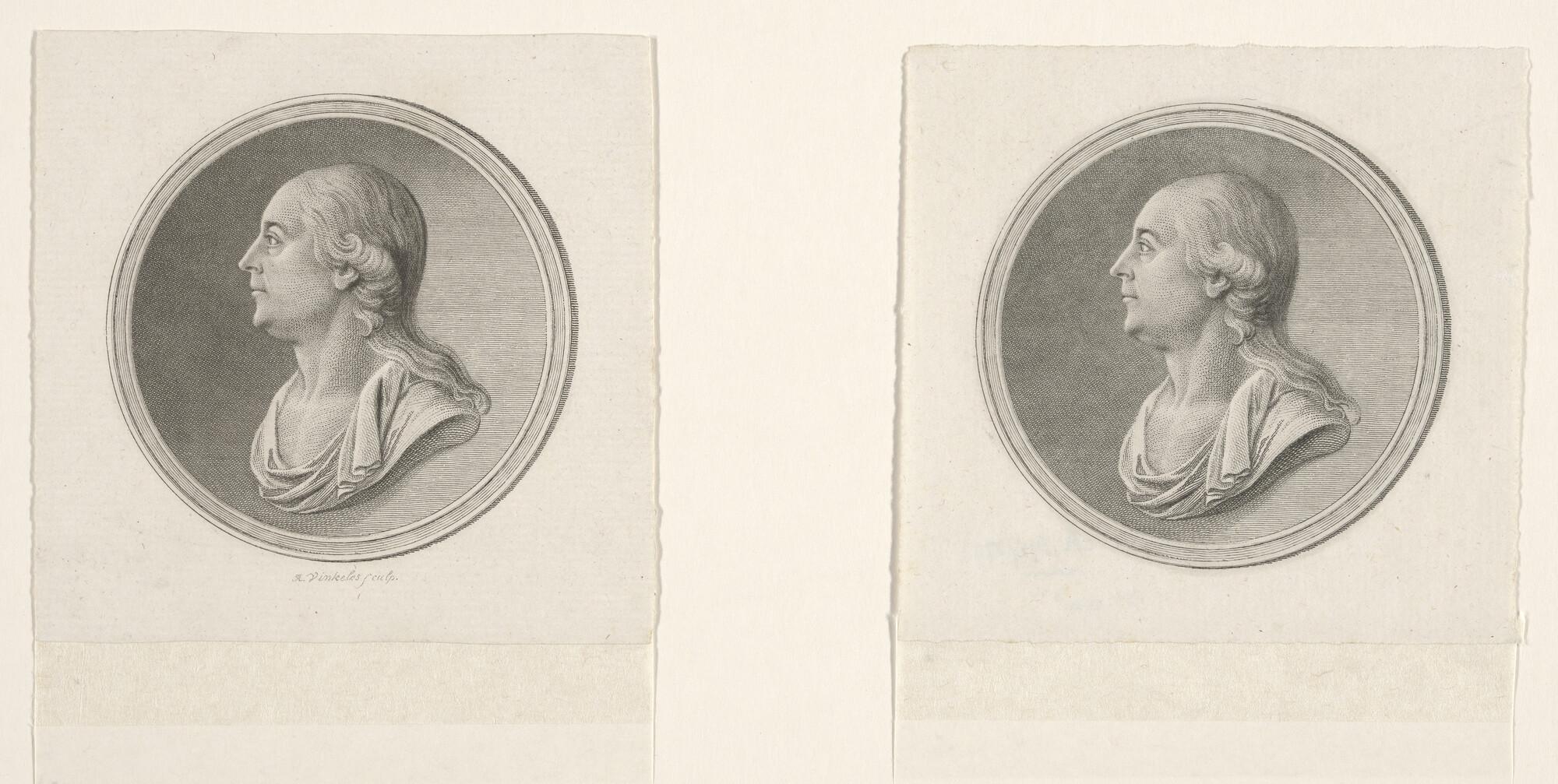 Portret van admiraal Van Kinsbergen, op lichte grond, en profil naar links in medaillon. Twee exemplaren.