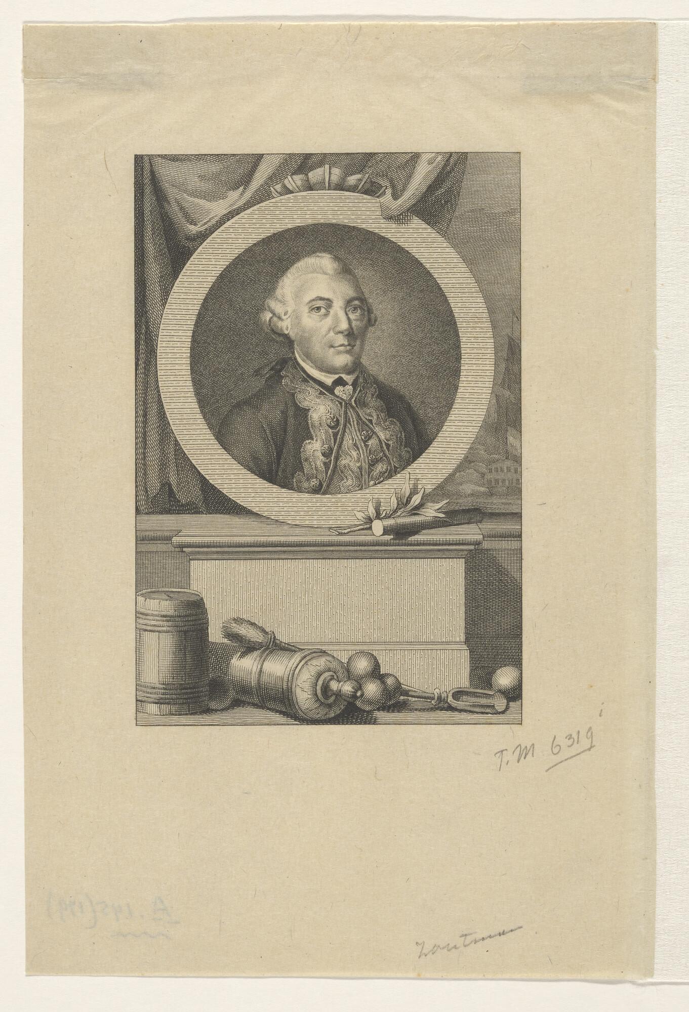 Portret van Johan Arnold Zoutman, in cirkelvormige lijst op voetstuk. Proefdruk op vloeipapier, voor alle letter.
