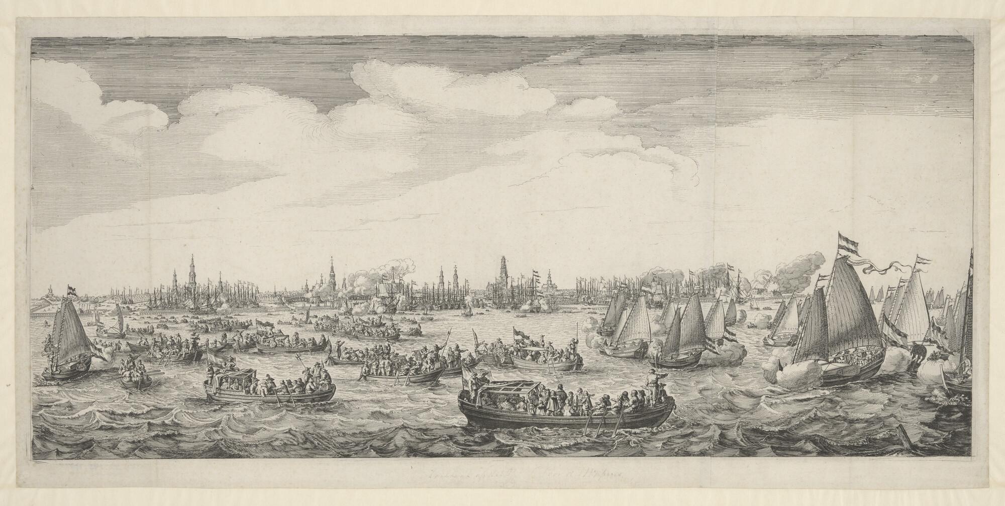 Feestelijke zeiltocht op het IJ te Amsterdam, ter gelegenheid van het bezoek van Maria de Medici, 1638. Illustratie uit C. Barlaeus, Medicea Hospes (Amsterdam 1638).