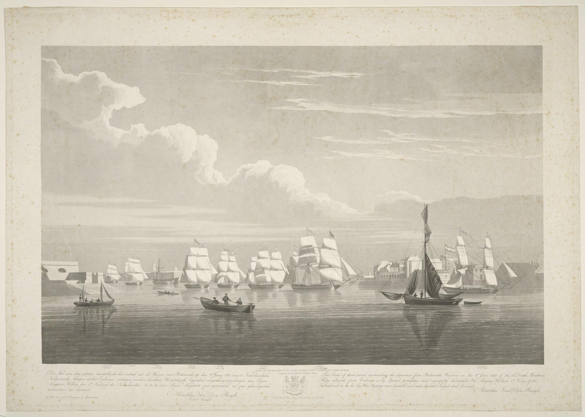 Vertrek van 12 Nederlandse koopvaardijschepen uit Portsmouth na het opheffen van het embargo in 1833. Eerste van een suite van drie prenten.