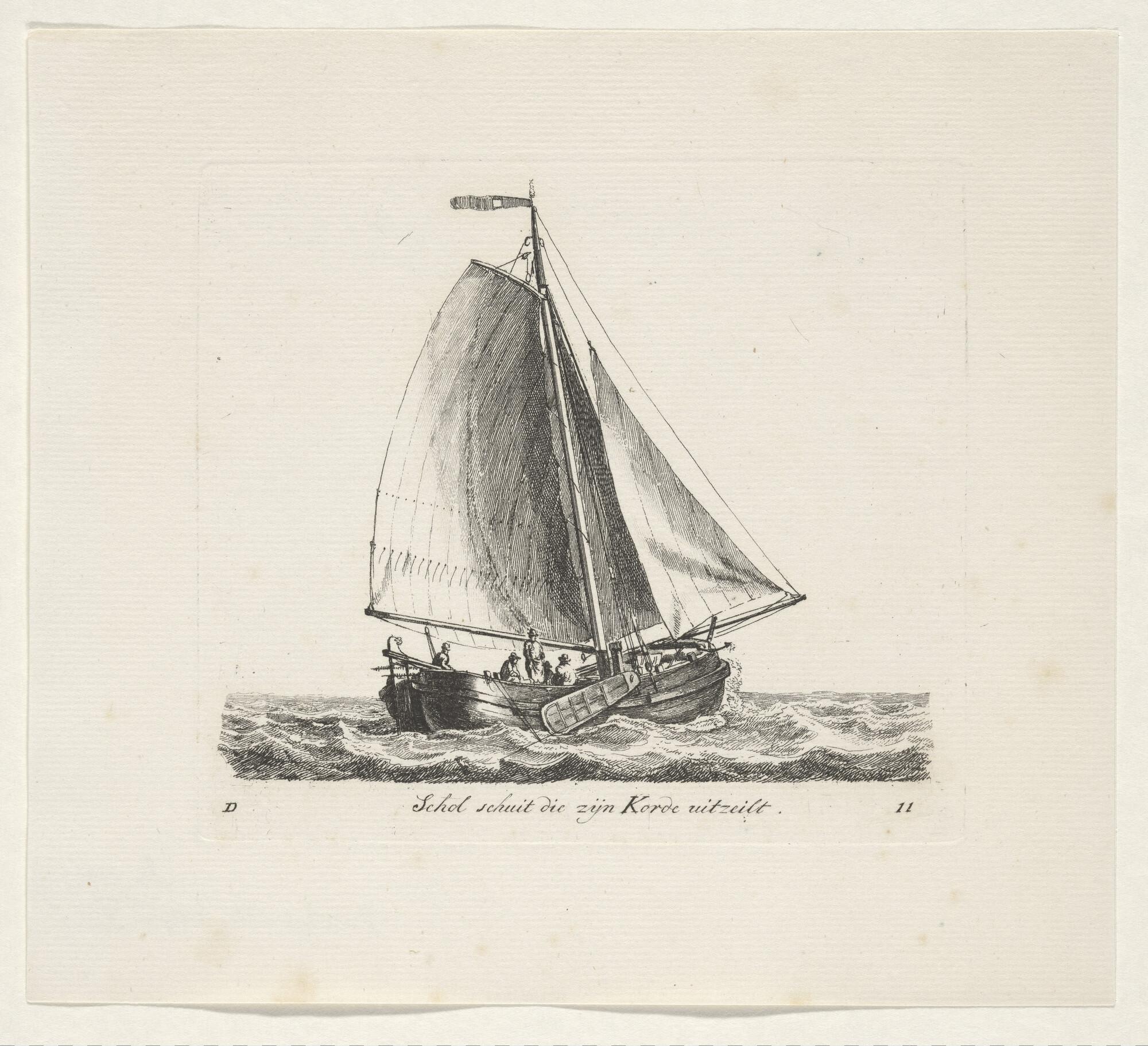 Prent van een scholschuit die zijn kor uitzeilt. Uit de suite 'Verscheide soorten van Hollandse schepen', vierde katern, D-11.