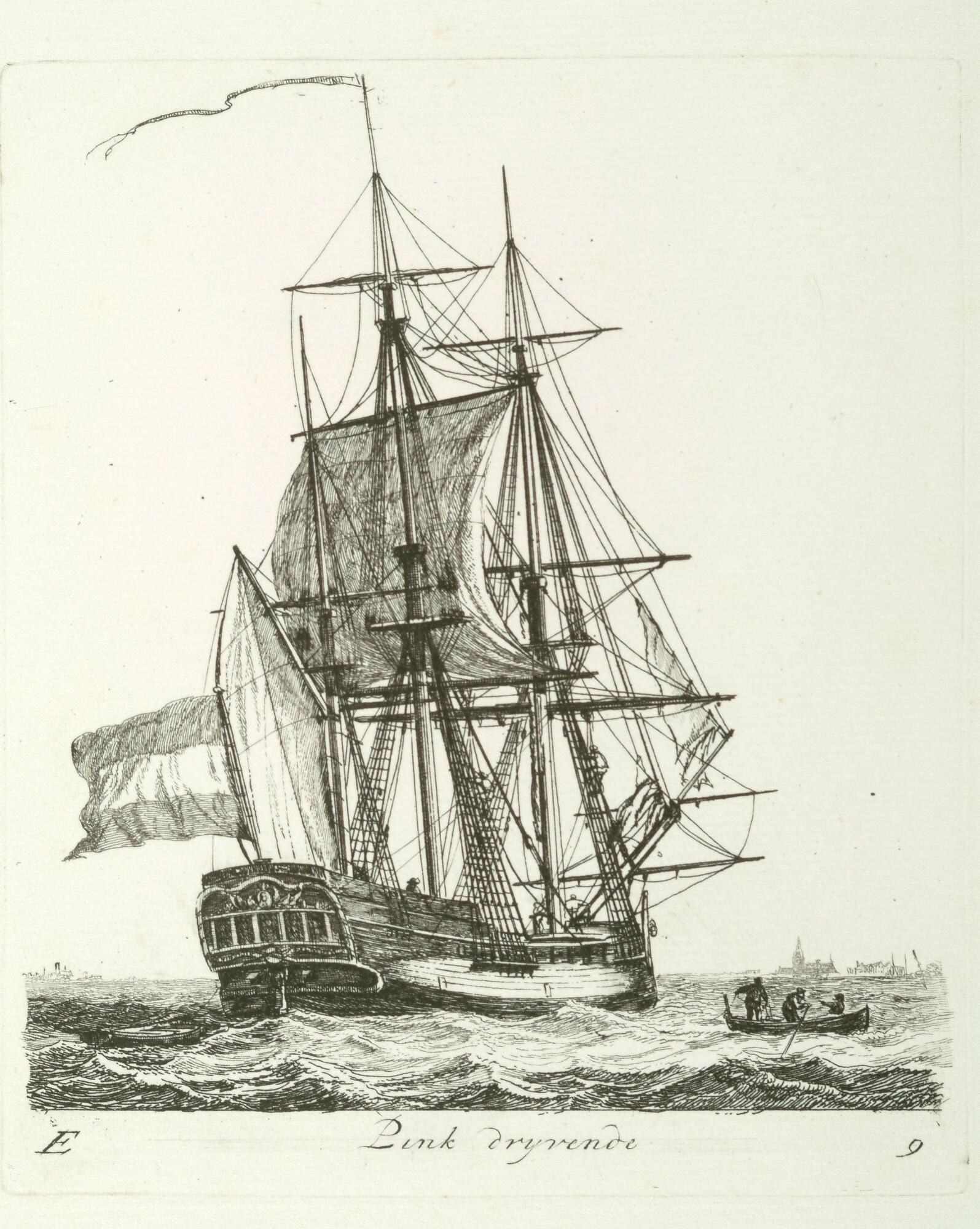 Prent van een pinkschip de rivier afdrijvende. Uit de suite 'Verscheide soorten van Hollandse schepen', vijfde katern, E-9.