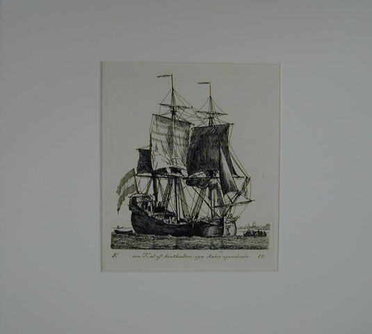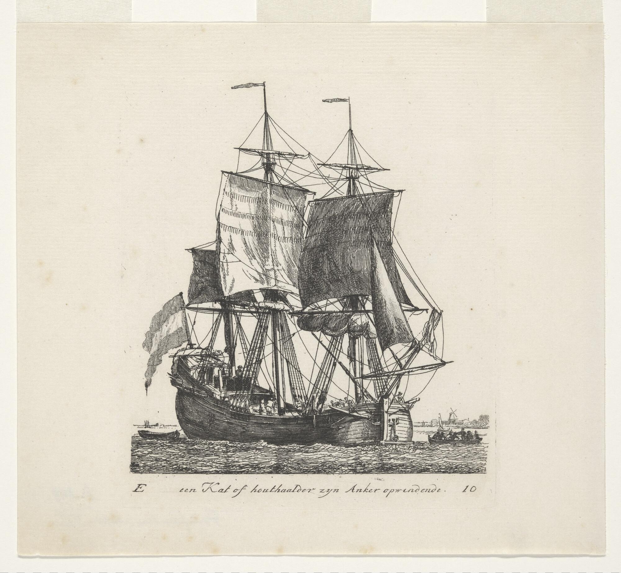 Prent van een katschip, bezig zijn anker op te halen. Uit de suite 'Verscheide soorten van Hollandse schepen', vijfde katern, E-10.