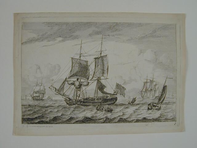Prent van een Engelse koopvaardijbrik en andere schepen in een riviermonding