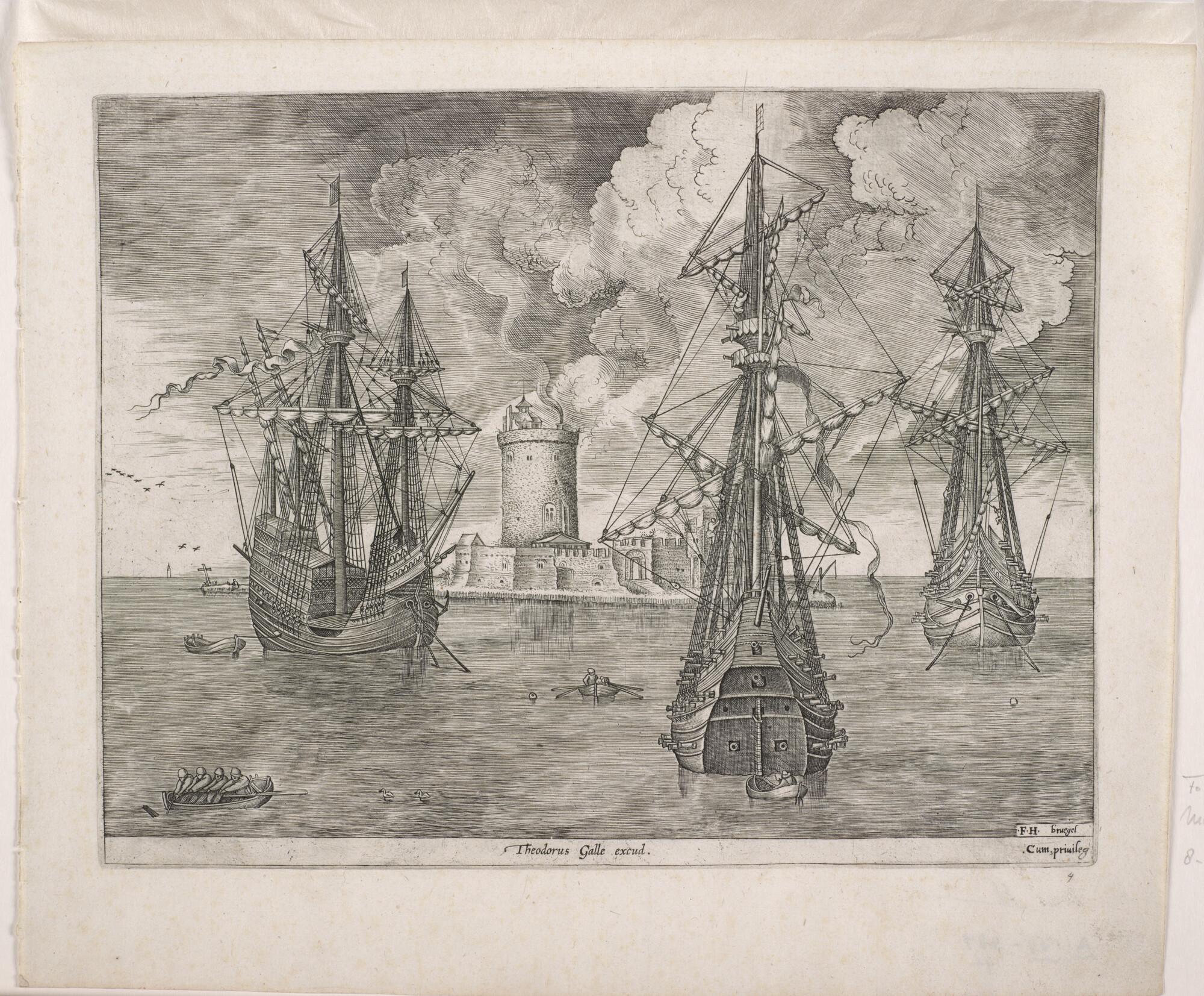 Uit de serie 'Oorlogsschepen': drie oorlogsschepen voor anker bij een waterfort.