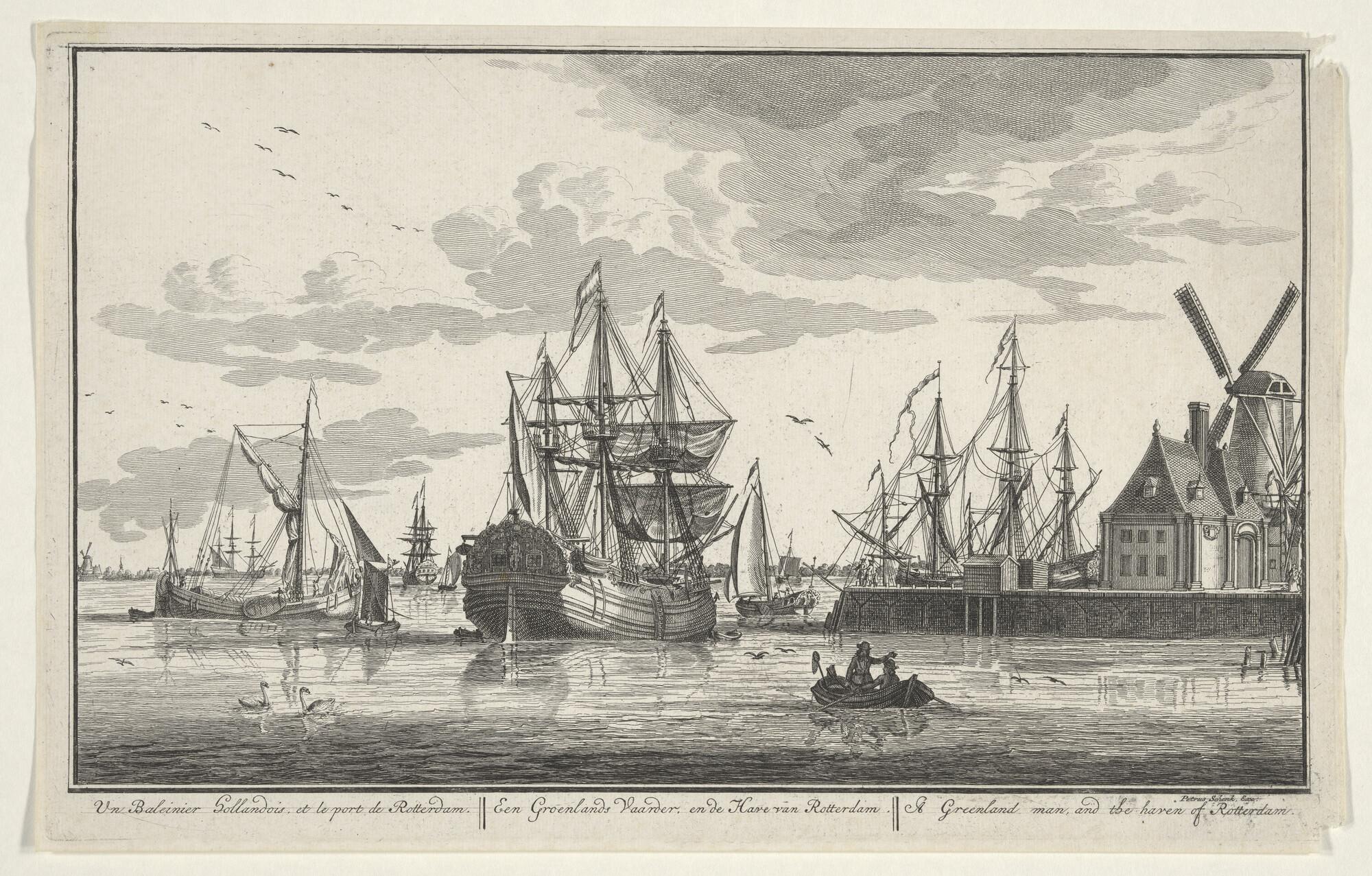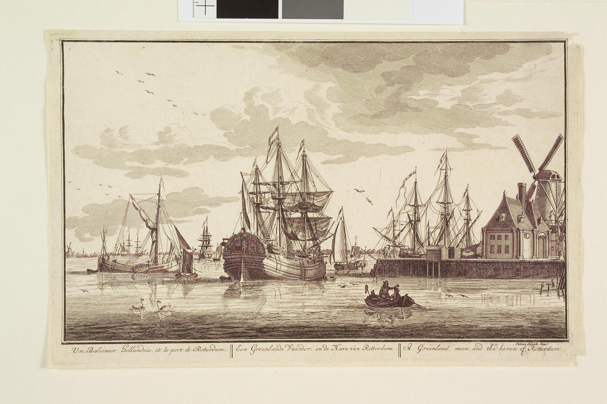 Prent uit de serie 'Zee, Land en Stroomlust': een Groenlandsvaarder voor de wal in Rotterdam.