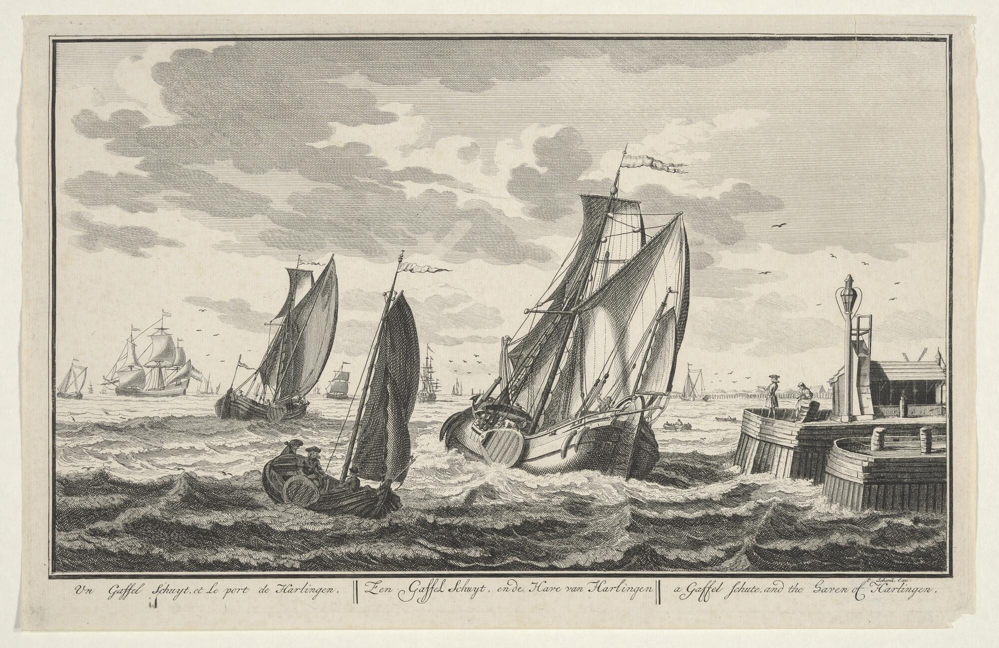 Prent uit de serie 'Zee, Land en Stroomlust': een gaffelschuit voor de haven