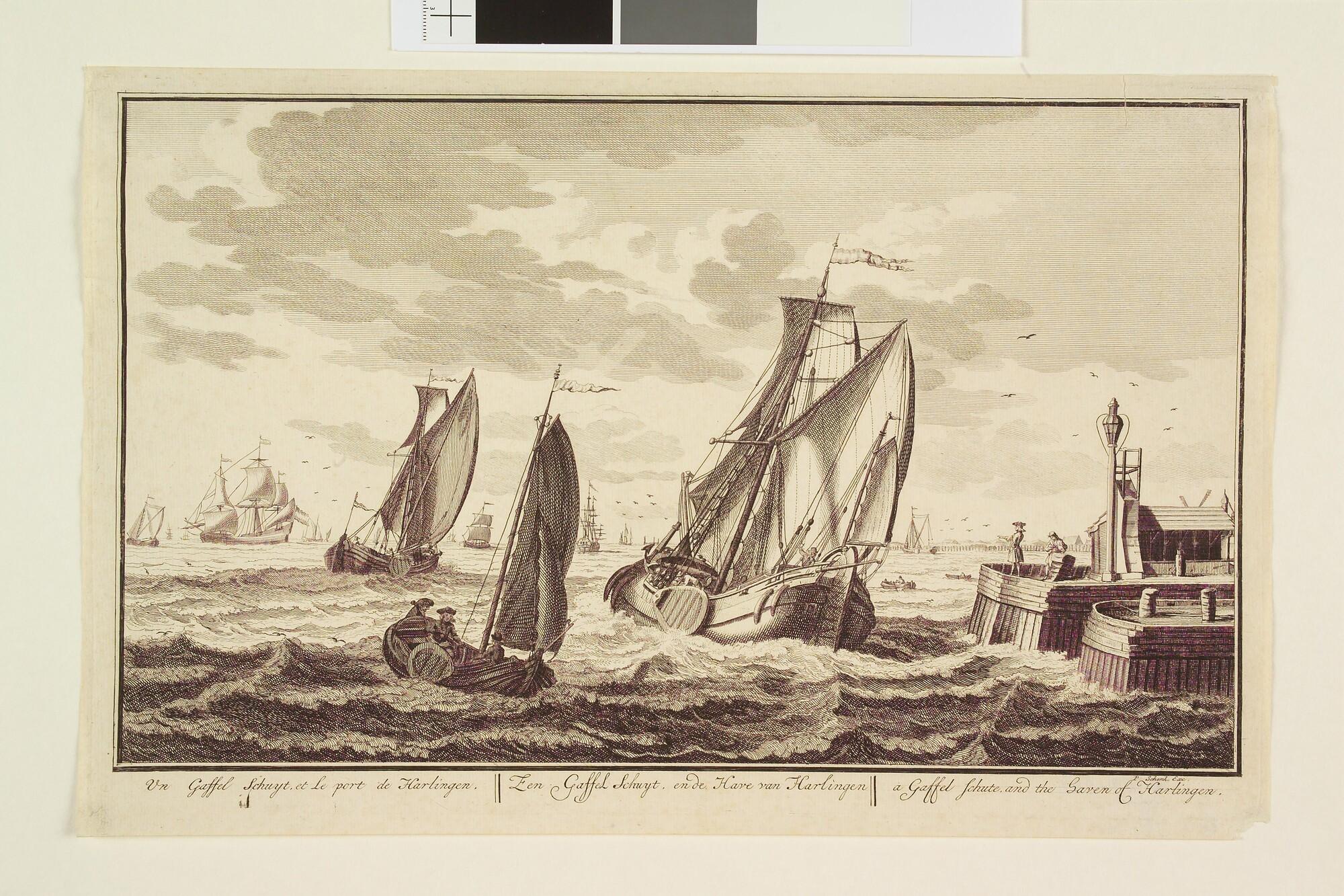 Prent uit de serie 'Zee, Land en Stroomlust': een gaffelschuit voor de haven van Harlingen.