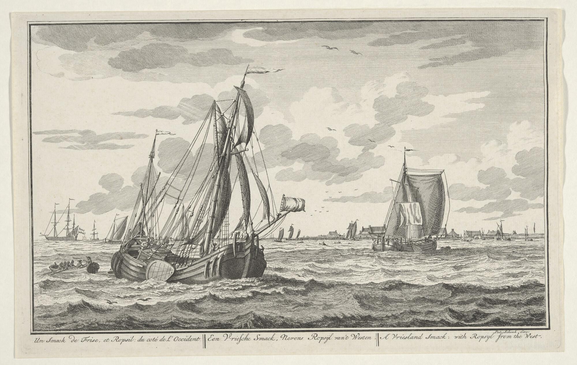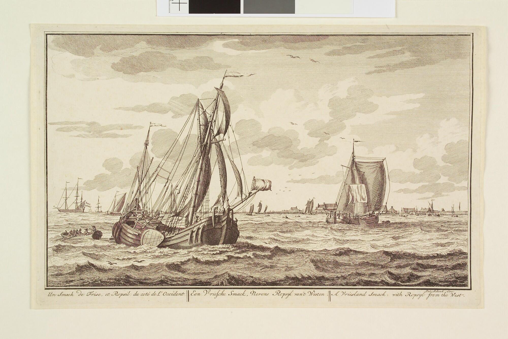 Prent uit de serie "Zee, Land en Stroomlust:een Fries smakschip onder zeil ter hoogte van Ropzijl.