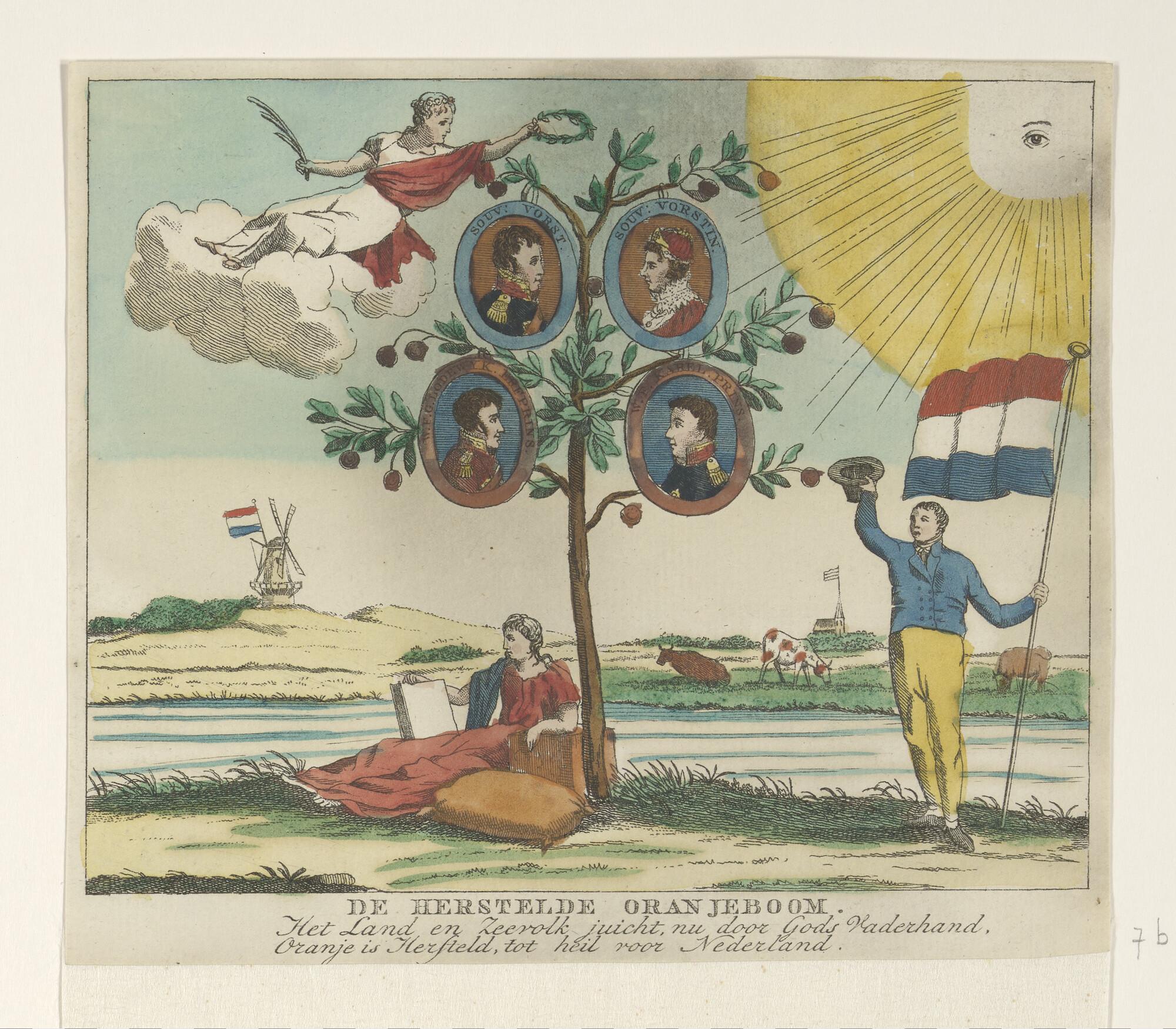 Allegorische prent op de herwonnen onafhankelijkheid, 1813: 'De herstelde Oranjeboom.'