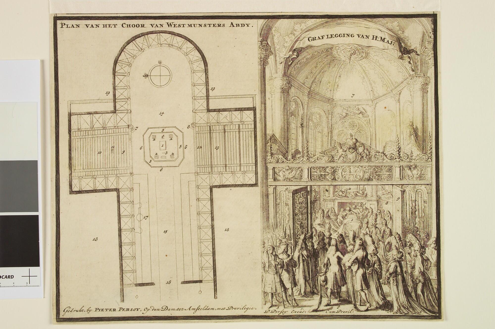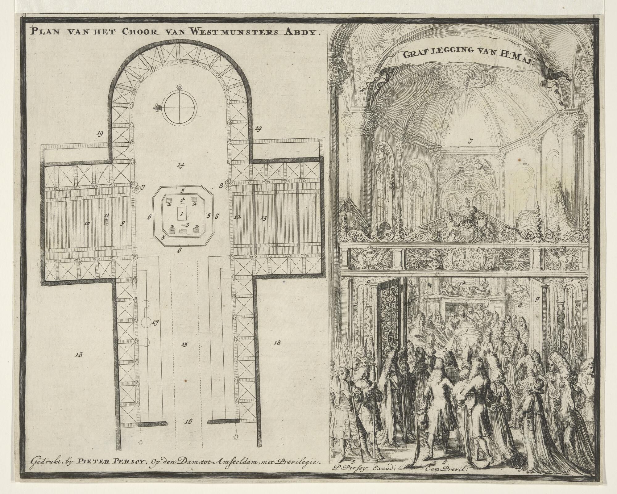 Dood en Lijkstatie van de Mary, koningin van Engeland, 1694; plattegrond van Westminster Abbey en de graflegging van de koningin.